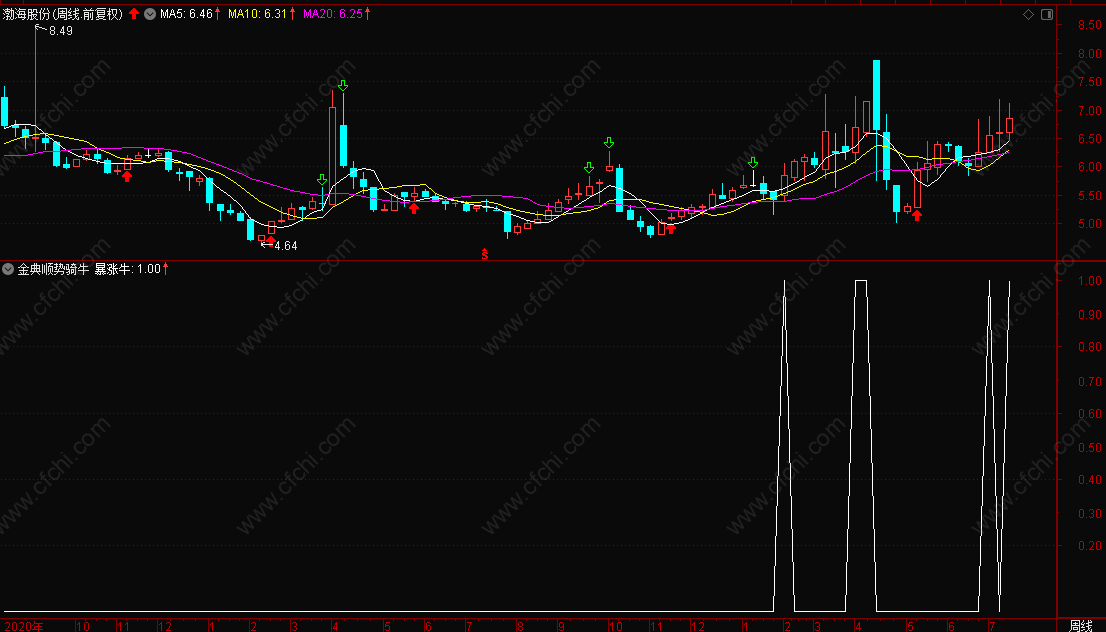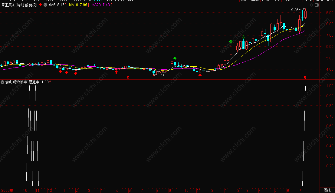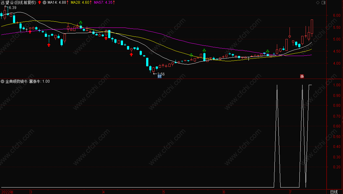 (金典顺势骑牛抄股指标短线追涨 暴涨启动通达信副图选股公式)