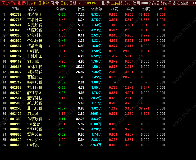 下图为9月26日选股,当日市场情绪极差,收盘后市场只有一个连板股,但是我们系统依旧选出3票,其中1票涨停,一票小赚,一票小亏