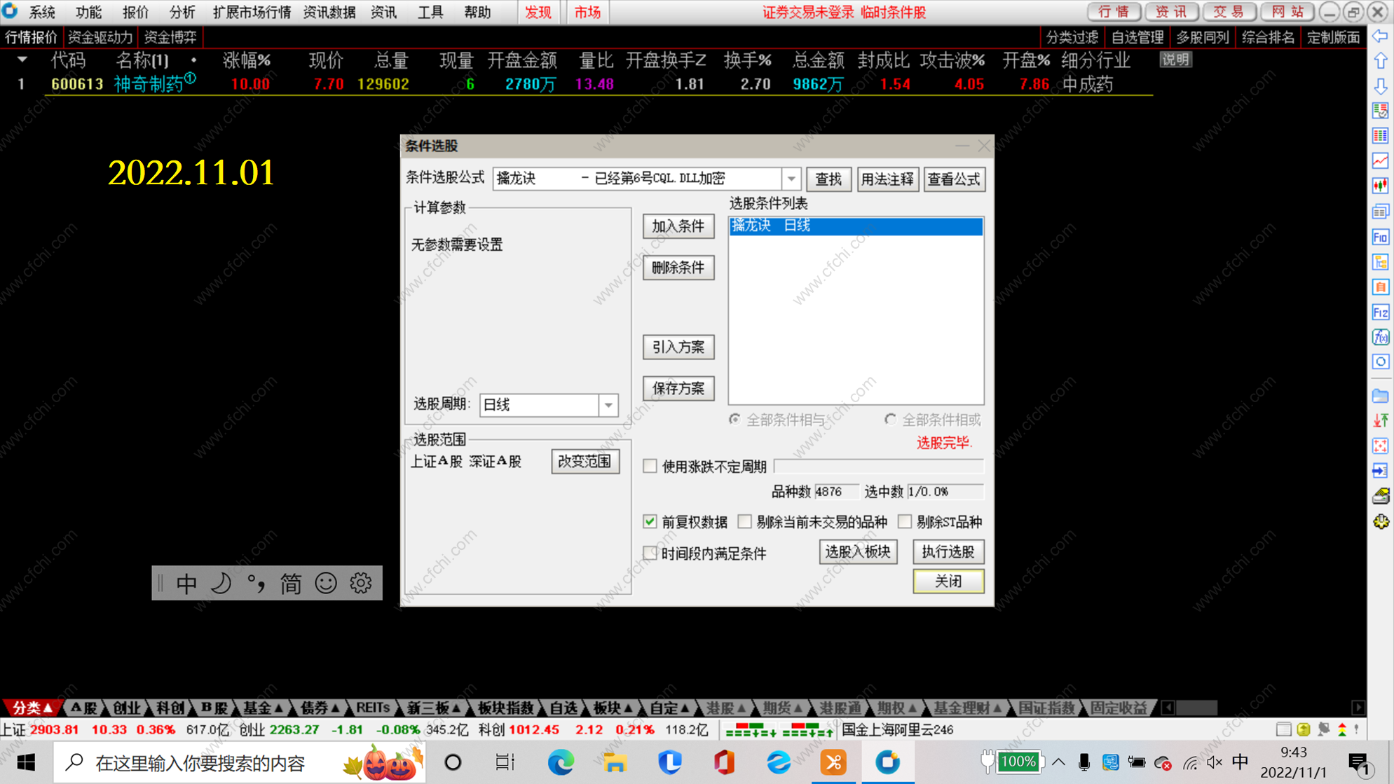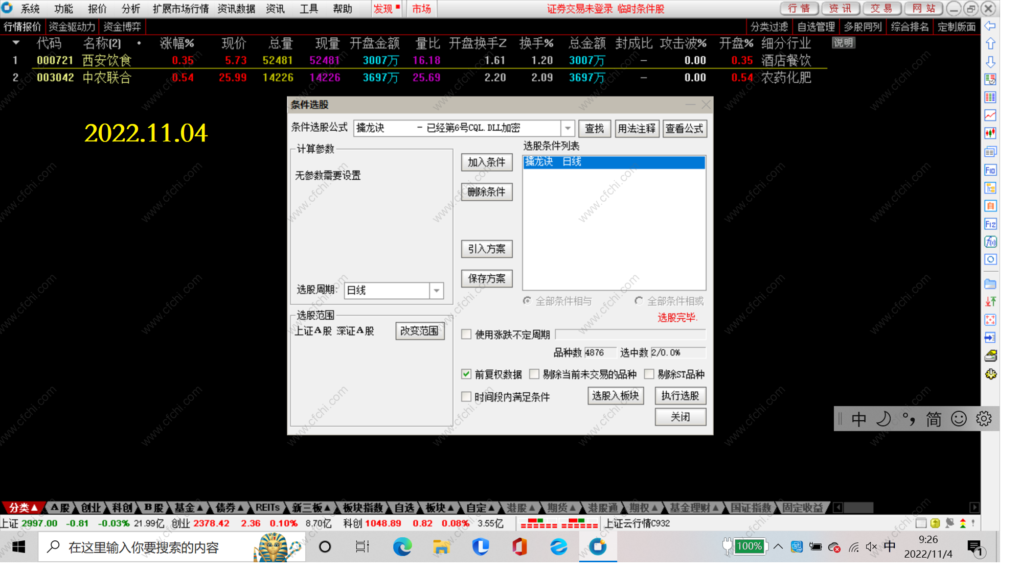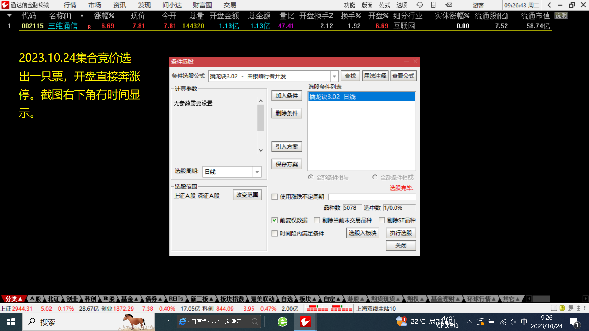 2.擒龙诀适合在电脑上安装了通达信的朋友选股使用,且可以在每天9:25以后的任何时间进行选股,省去了朋友们为选股而花大量的时间和精力。且可以在9:30开盘之前快速了解擒龙诀选出的股票,为交易提前提供参考。