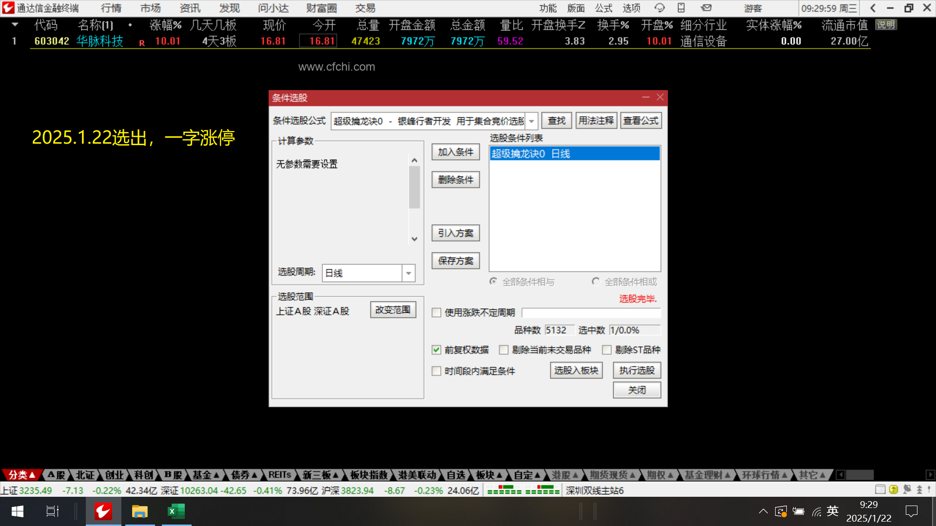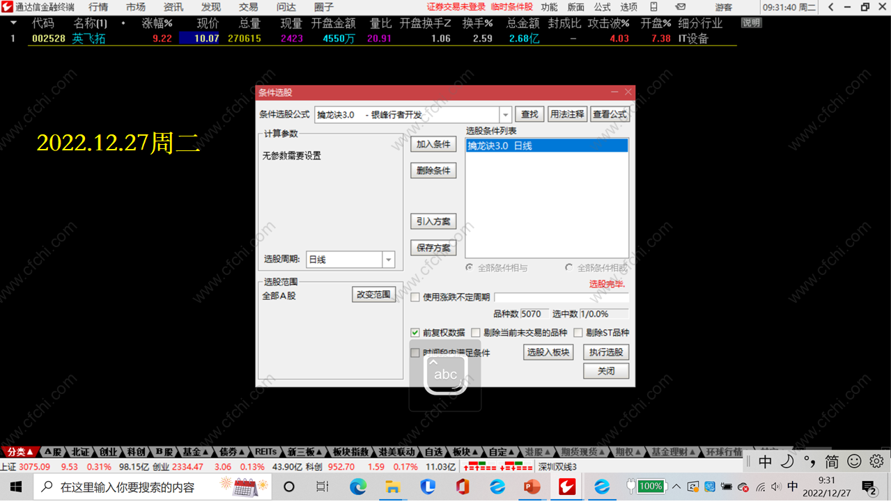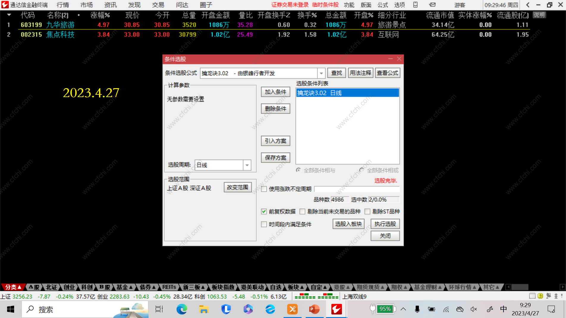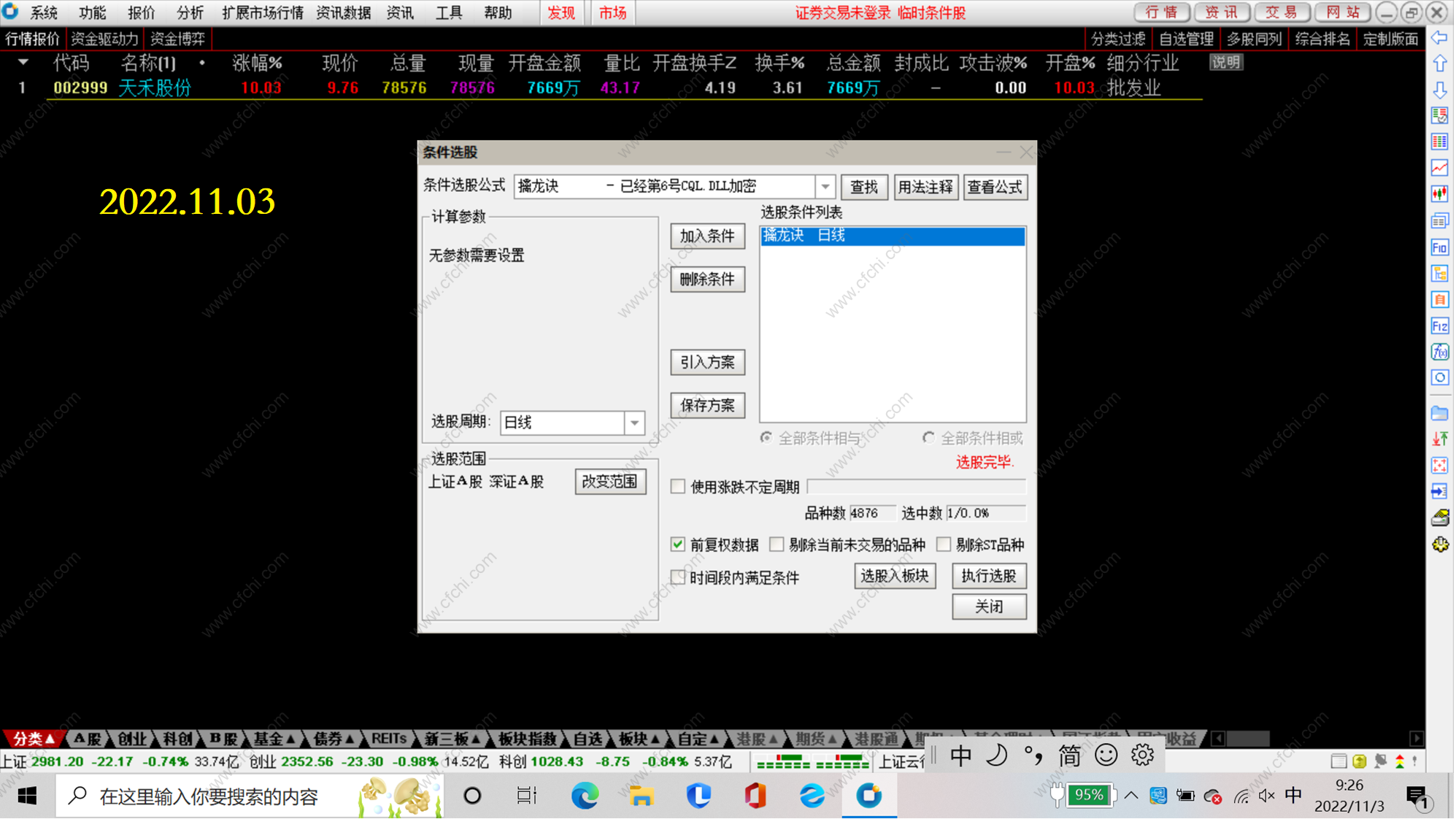 2.擒龙诀适合在电脑上安装了通达信的朋友选股使用,且可以在每天9:25以后的任何时间进行选股,省去了朋友们为选股而花大量的时间和精力。且可以在9:30开盘之前快速了解擒龙诀选出的股票,为交易提前提供参考。