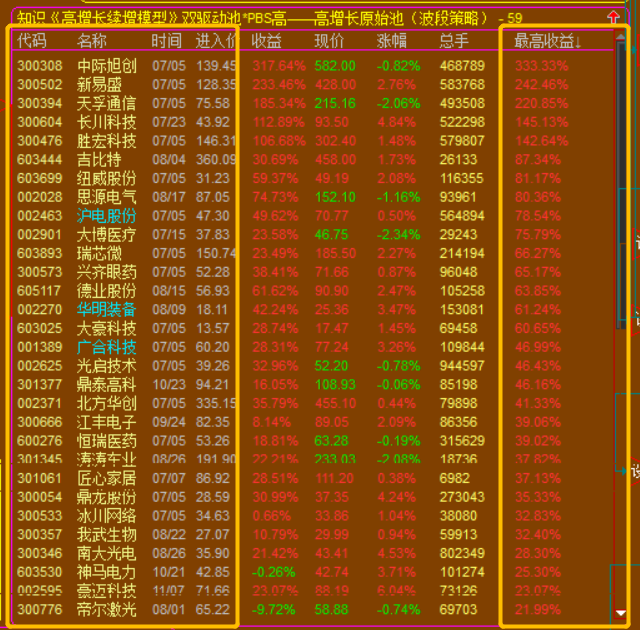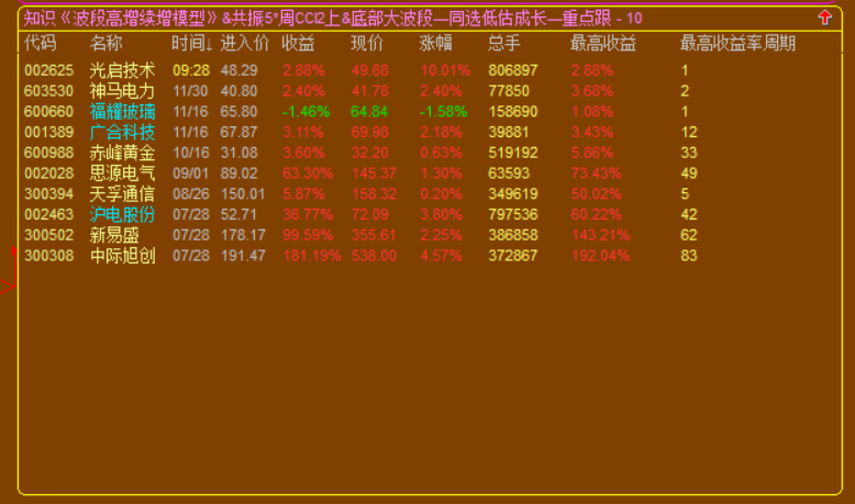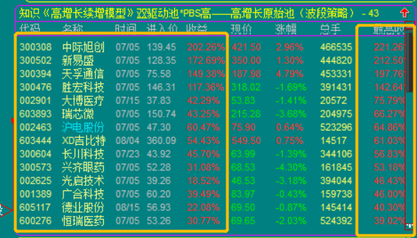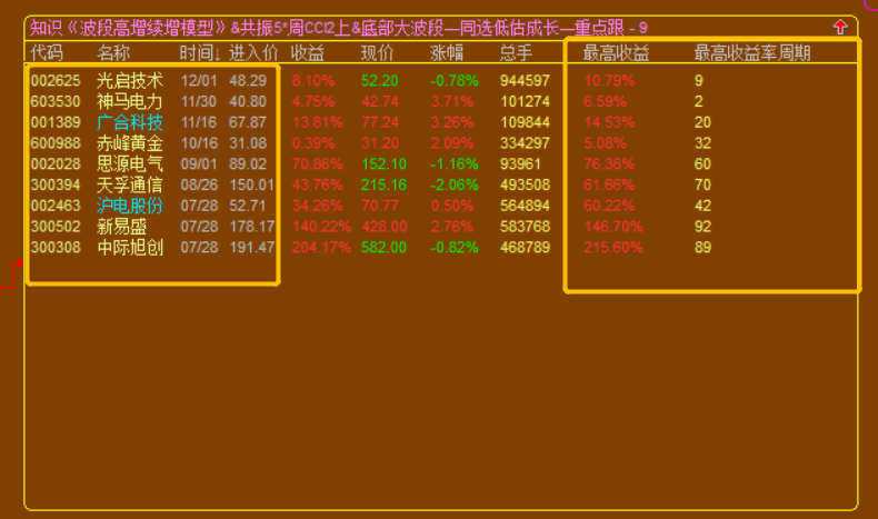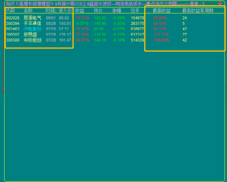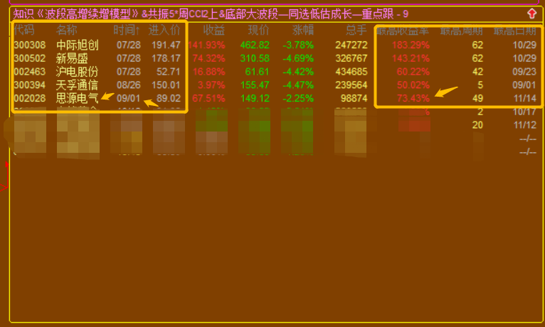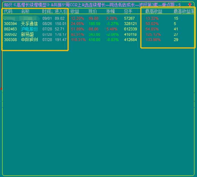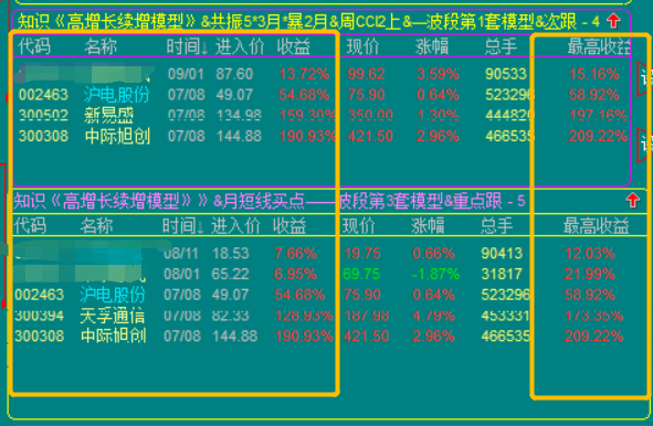 3.高增长续增模型,出股较少,因为设置的是技术性底部买点;所以属于波段投资模型,可以做大波段做T的高抛低吸,也可以做小波段的反复轮动模型;