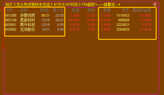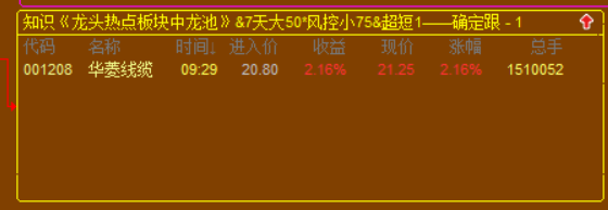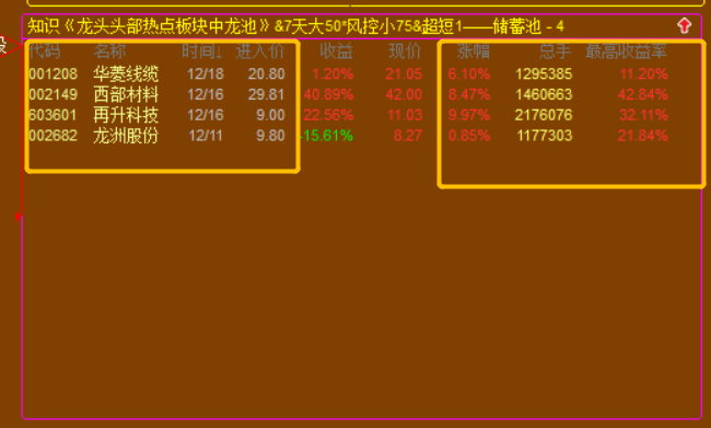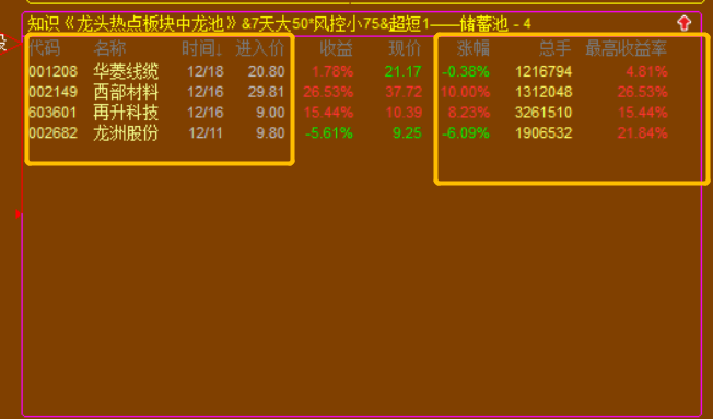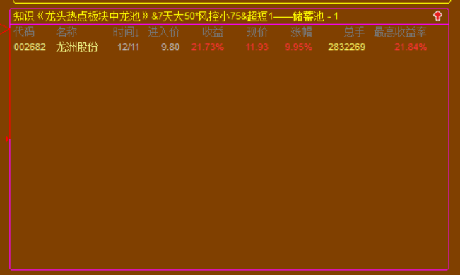 1. 《龙头热点板块中龙池》,配合的是我的《龙头热点板块》使用,我的《龙头热点板块》通过自建的体系逻辑,能够在每天收盘后自动复盘选出,当天板块强升度最强的板块,次日一定能延续涨幅的板块;而《龙头热点板块中龙池》就是以这个板升度最强的板块为依据,将其成份股进行龙头规则筛选,最后选出板块内还有继续上升+还未到顶的龙头个股;