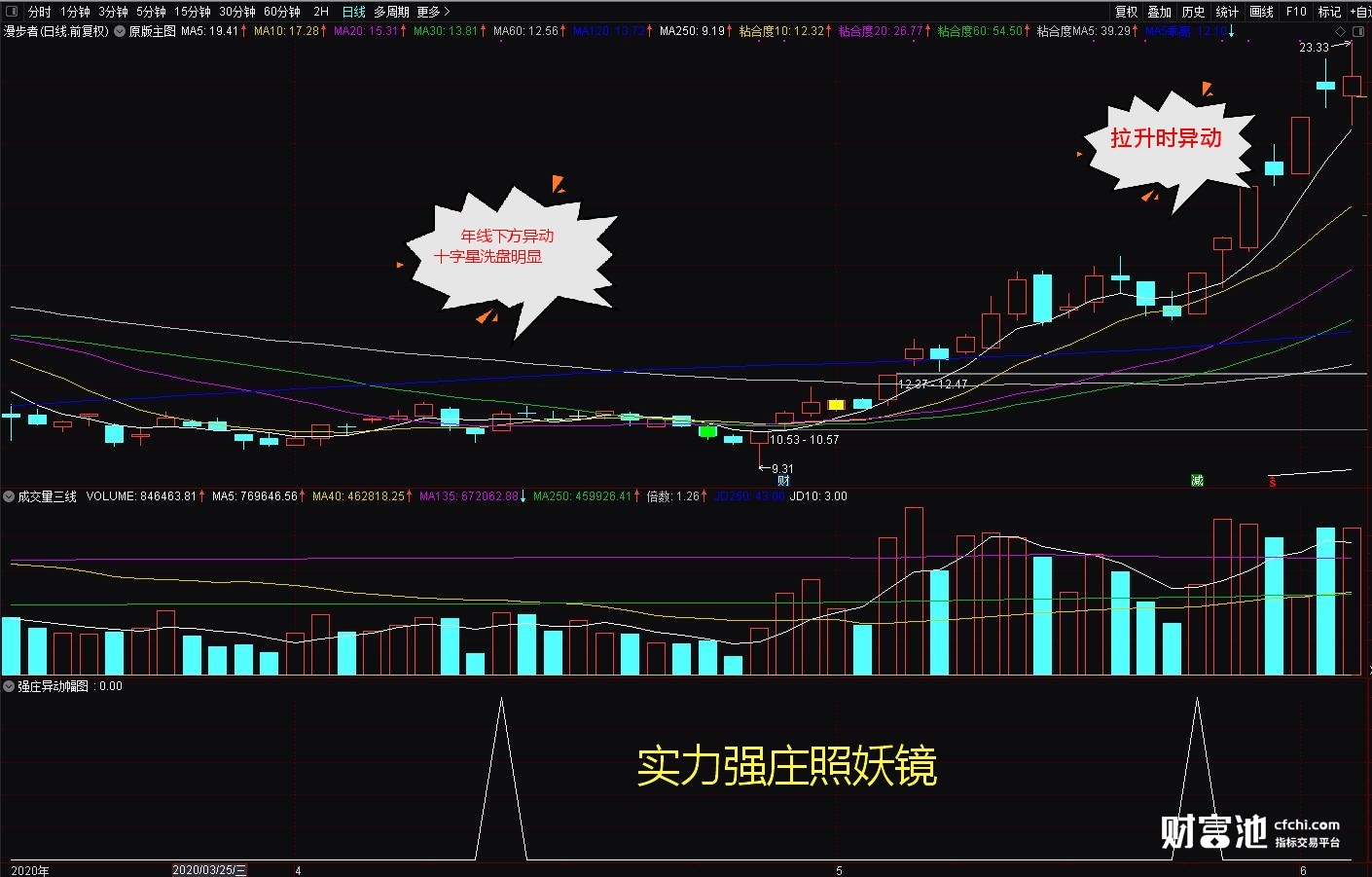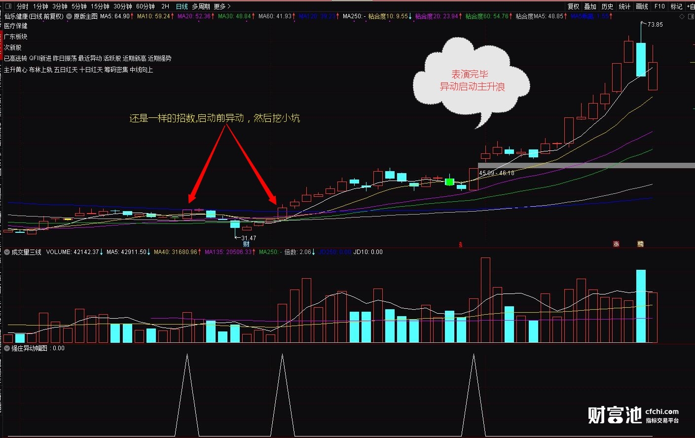 提醒:指标公式不是万能的,但没有指标公式是万万不能,一个好指标能帮你节省有限的时间跟有限的精力,指标公式只是一个思路的总结,能让你在第一时间发现合乎这个思路牛股的形态,买卖决策还是要自己决定的,如果您想用本公式每次预警都稳赚不赔,那么我明确告诉您:不可能,世界上没有任何软件可以做到。主力异动提前看捕抓主力异动照妖镜幅图和选股指标请您绕道而行吧!