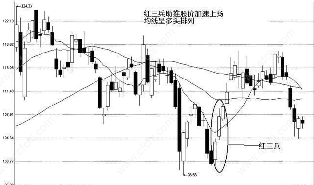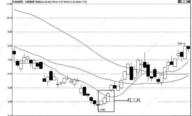 价格处在市场底部振荡,市场沽空一方无力再度做空;而做多一方觉得价格经过下跌,已处在超卖状态,可以做多;观望一方比较了多空力量,认为多方有利,而进场建立多仓。市场受此合力影响,形成3天连续上扬局面。红三兵意味着多方力量刚起步,随着力量的不断释放,将会形成真正的上涨。
