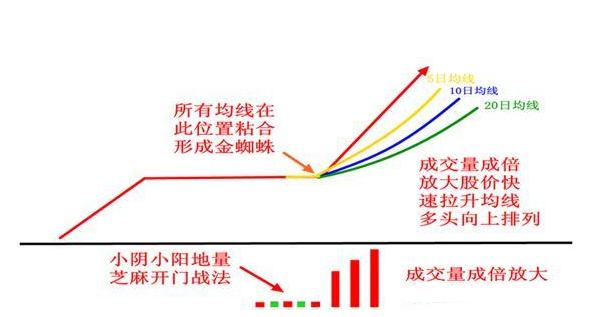 “金蜘蛛”买入法:是指从高位向下移动到低位后拐头向上汇合在一起的形态。由5日,10日,20日均线交叉于一点,然后股价站在交叉点之上的均线技术形态,标准的三线合一是比较少见的,俗称“金蜘蛛”。它要求至少有两条均线金叉,若是普通交叉或是死亡交叉那就够不成金蜘蛛。