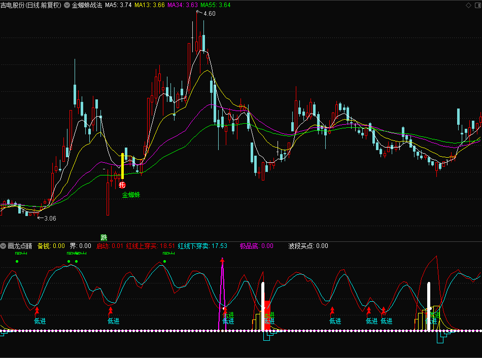 3. 上述形态发生前,股价经历过一个平台横盘整理后,某天股价突然放量拉升,一阳定闲坤,三条均线被这一大阳线贯穿,金蜘蛛形态就此确立。
