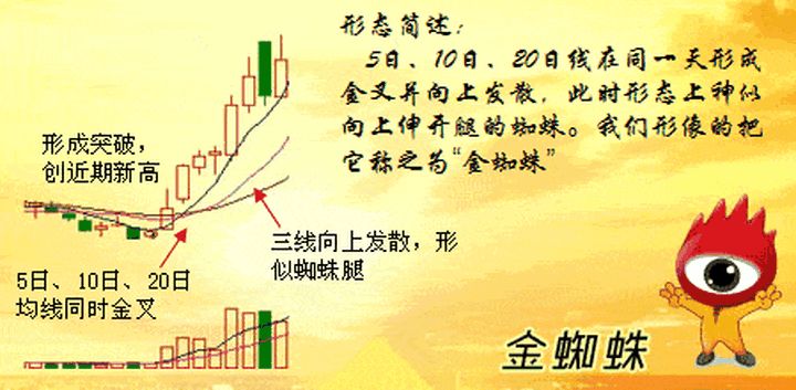 今天就告诉大家实战法则——“金蜘蛛”。具体操作中如何去找这只金蜘蛛?金蜘蛛是5日,10日,20日均线交叉于一点,然后股价站在交叉点之上的均线技术形态。它要求至少有两条均线金叉,若是普通交叉或是死亡交叉那就够不成金蜘蛛。该形态是看涨信号,发现了就需要马上收看这只“蜘蛛精”。