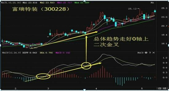 上图是富瑞特装(300228)2015年2月到5月份的走势图,该股票总体趋势走好,均线多头向上,经过3月上旬横盘调整,在3月26号MACD二次金叉现入场信号后急速拉升一路走高。