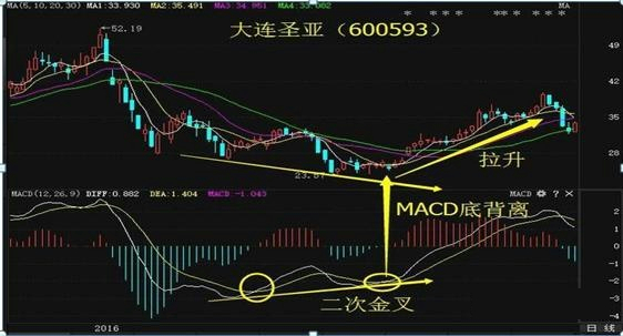 上图是大连圣亚(600593)2016年1月到5月份走势图,该股票经过前3个月的下跌已经创出了新低,创新低后低位横盘调整,3月11号MACD出现二次金叉后快速拉升。