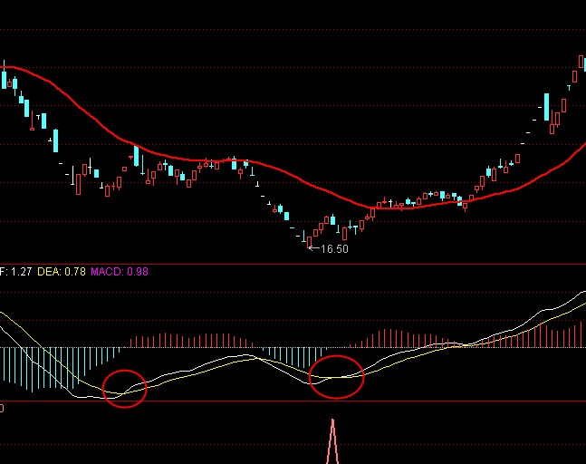 2、当DIF和DEA都在零轴之下,而DIF向上突破DEA时,表明股市即将转强,股价跌势已尽将止跌朝上,可以开始买进股票或持股。