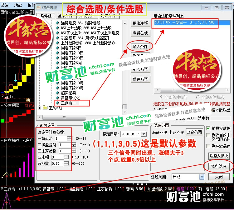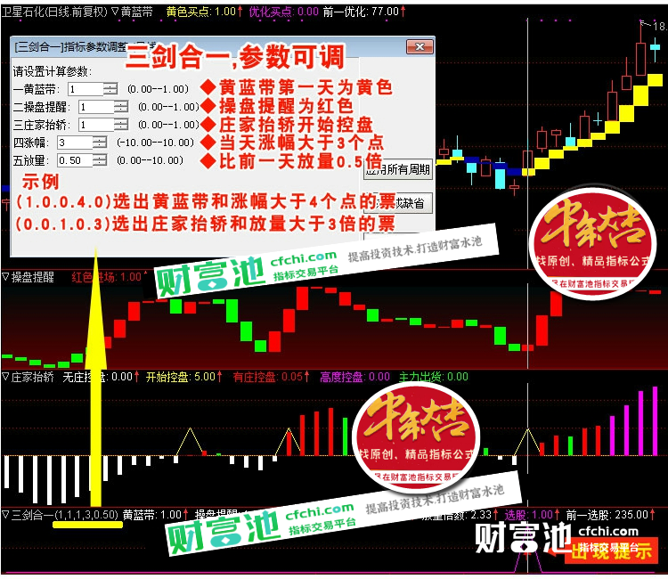 财富池指标公式网(www.cfchi.com)提醒您:指标公式是通过数学逻辑角度编写而来,仅是股票分析环节中的一个辅助工具,对股票选股效率和分析便捷上起到一定的作用,股市是具有不确定性和不可预测性的,请正常对待和使用指标公式!