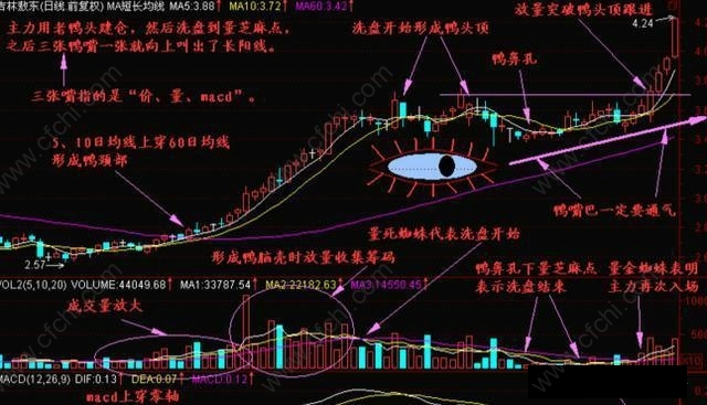 老鸭头是短线主力造就一种经典技术形态,通常是主力经过建仓、洗盘、拉高等一系列行为之后所作成的。