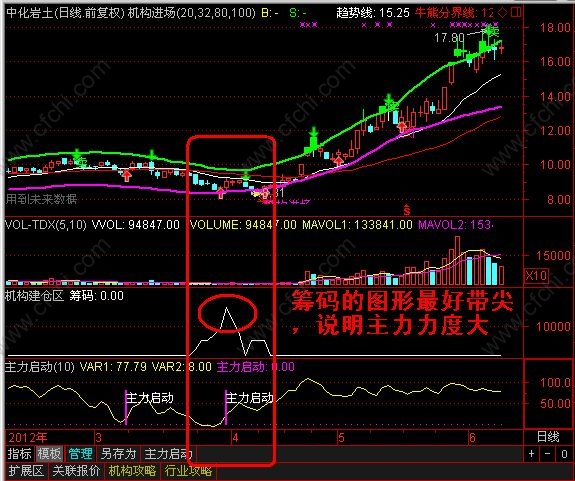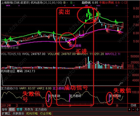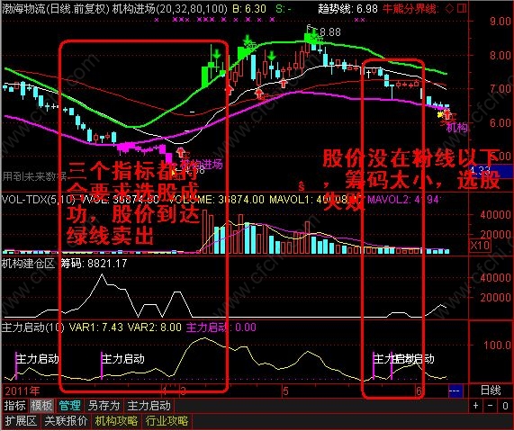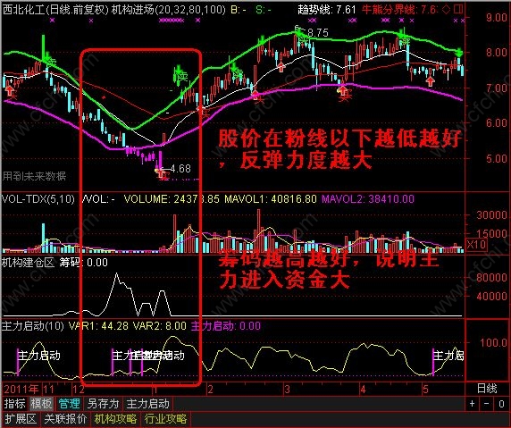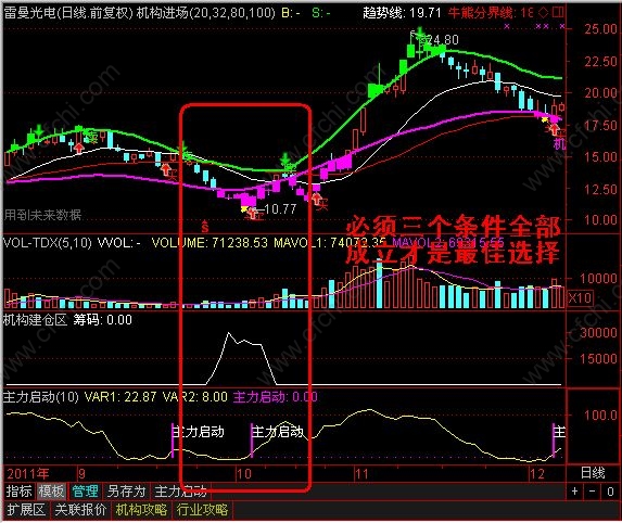 注:机构建仓区数值越大说明机构进场资金越强,拉幅越高。主图机构进场主要看上下轨粉线和绿线区域,未来函数有一种很大的特点,就是:反应非常的灵敏,具有别的指标不具备的预见性。副图主力启动和机构建仓区无未来数据。成交量方面下跌放量到下轨不要买,一定要成交量萎缩后在放量到底部下轨在买进。只要把握好四点一线和成交量地量基本能达到百发百中。不管你用什么办法在股市上都赚不了钱的时候后,请使用本系统会给你带来意想不到的收获。