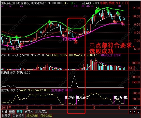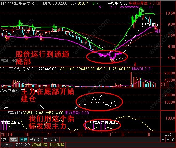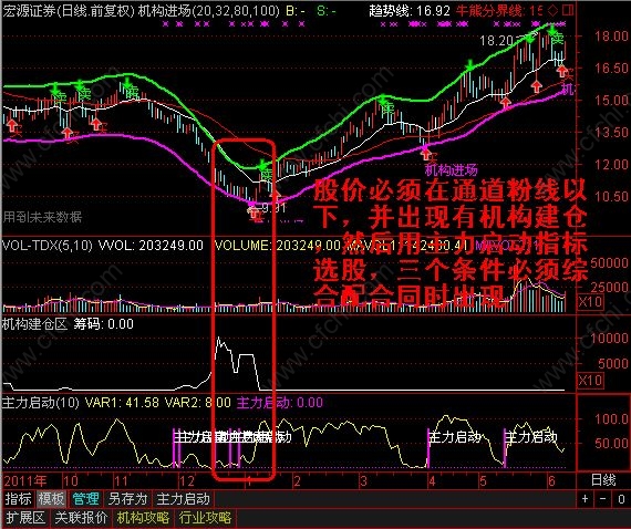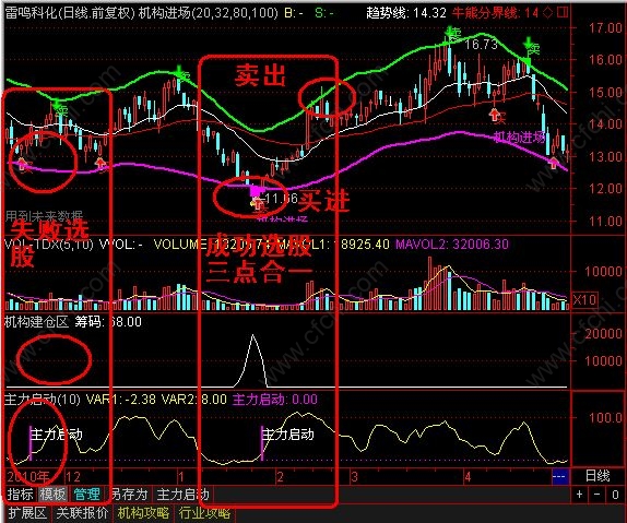 四点一线=主力启动+机构建仓+股价在通道下轨+有机构进场提示=买进