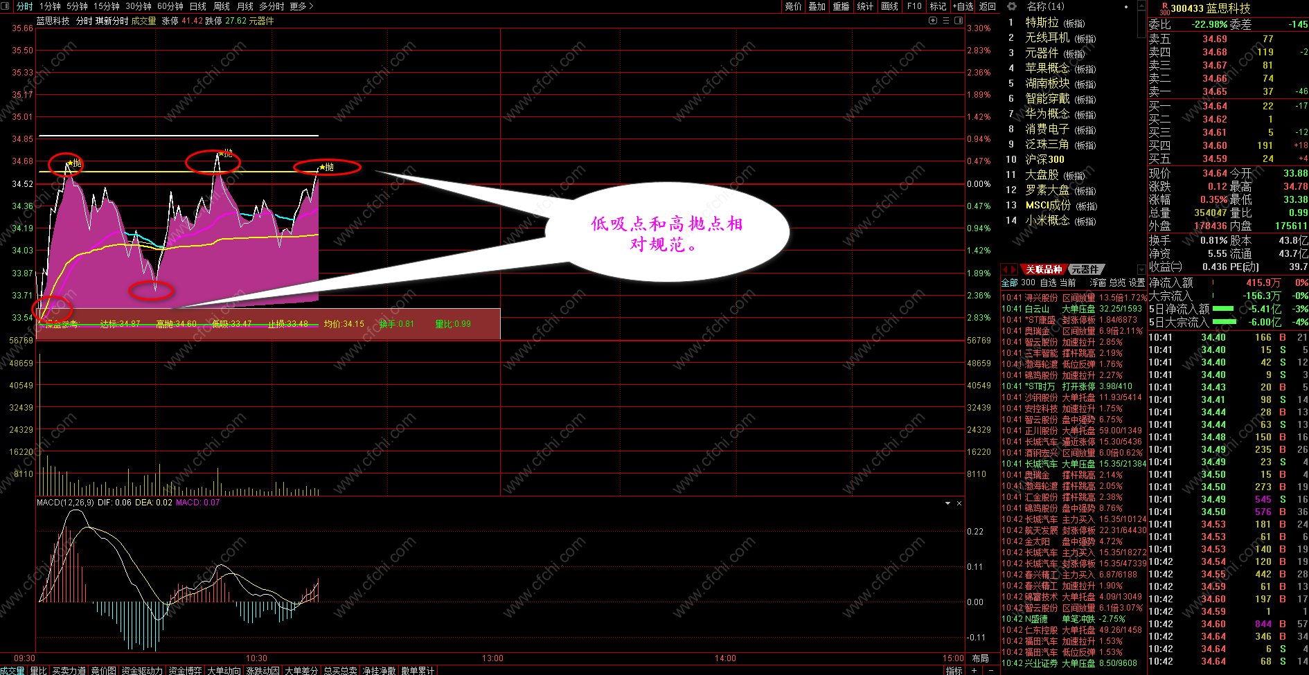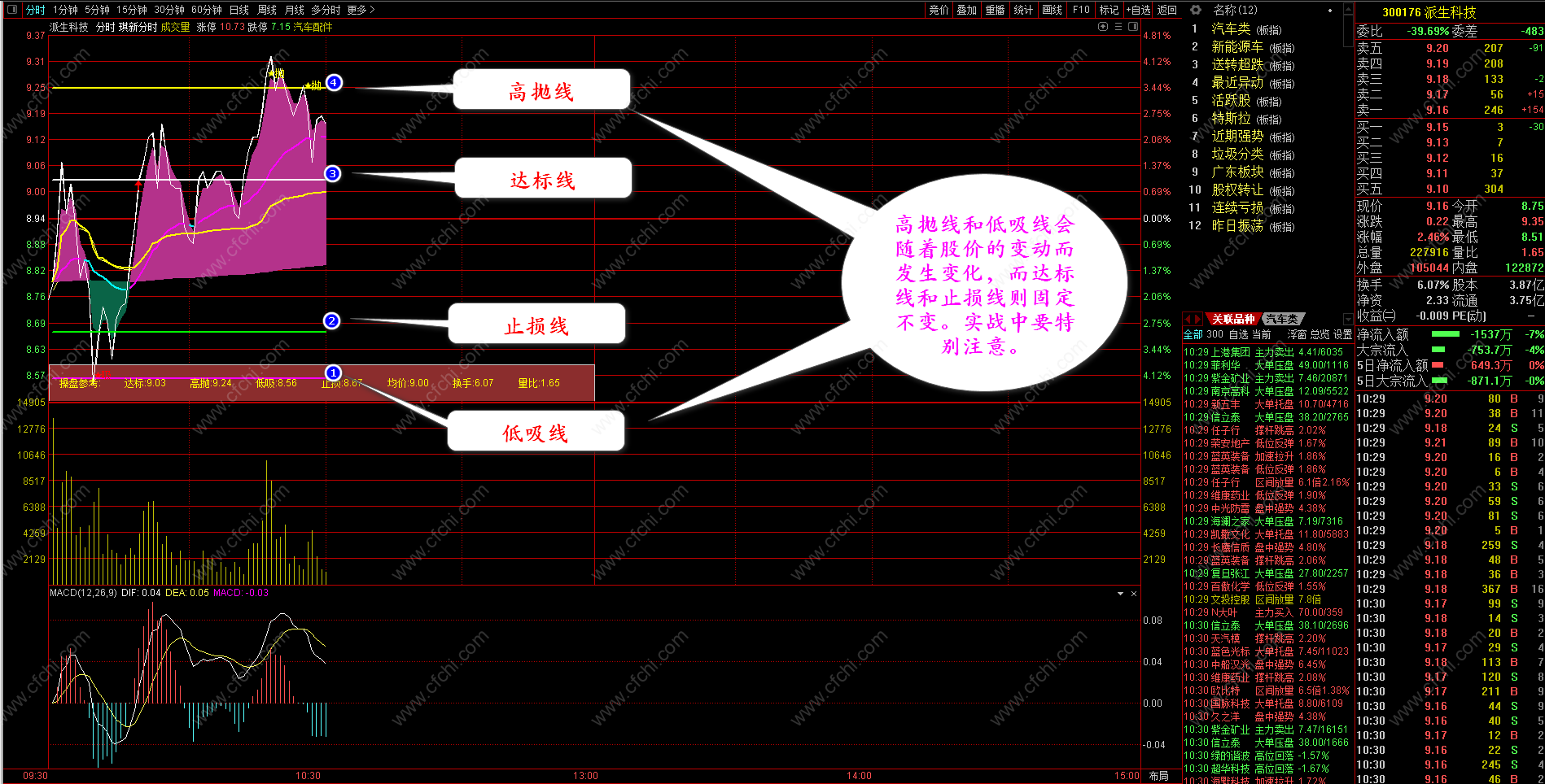 分时主图指标是最新编写的盘中低吸高抛决策指标,它把股价的运行划分为低吸区、高抛区、达标区和止损区四个区域,使用者可以根据股价所在的位置采取不同的操作策略,以达到低吸高抛的目的。由于分时走势中股价波动频繁,所以低吸区和高抛区位置会发生变化,这个需要在实战特别注意。但达标区和止损区位置是固定的,这个在盘中不会变化,请大家放心使用。