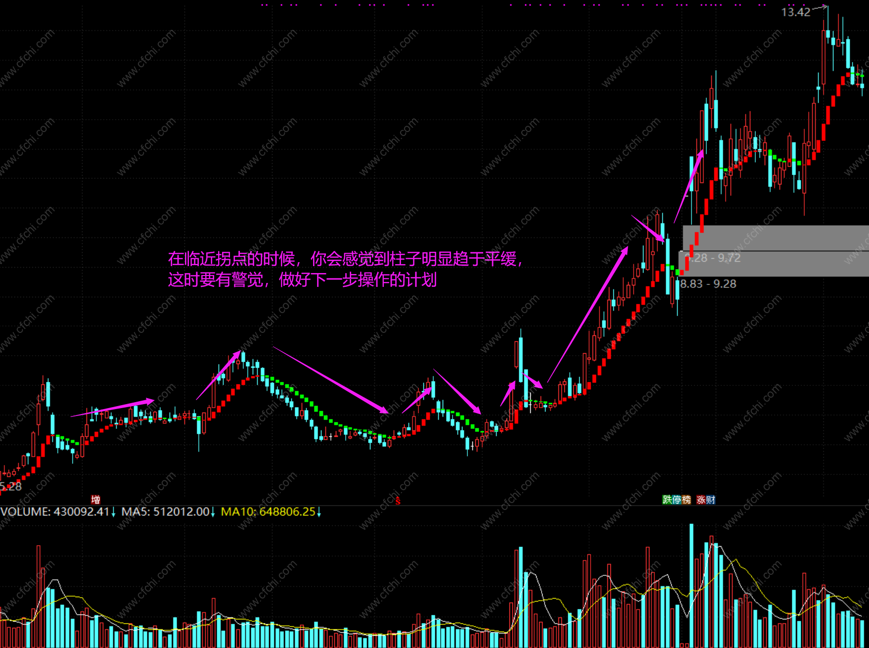 在临近拐点的时候,你会感觉到柱子明显趋于平缓,这时要有警觉,做好下一步操作的计划。