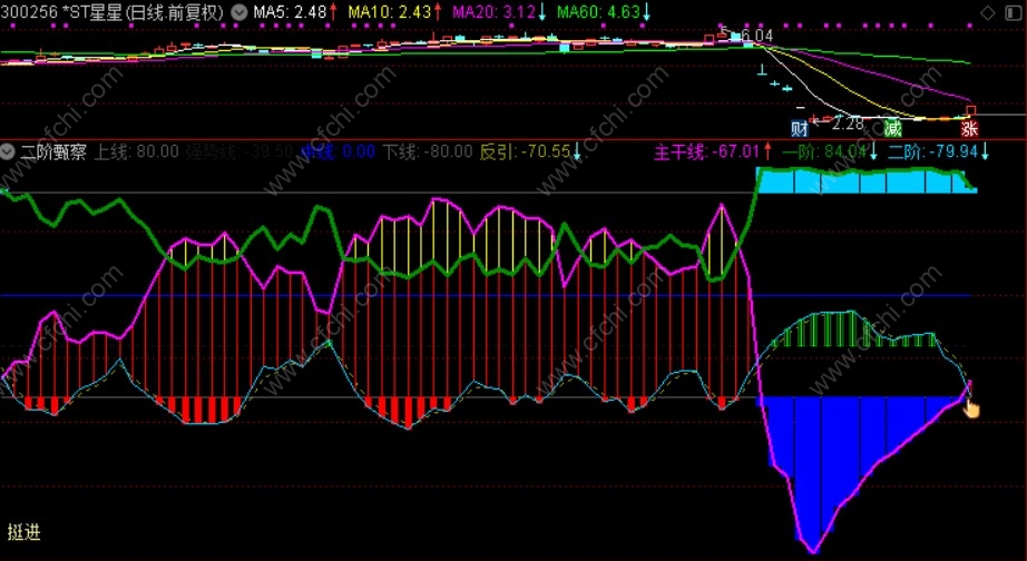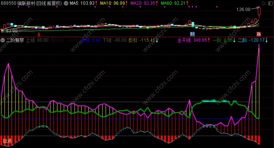 在新疆库尔勒出差一个月了,周五回到了江汉大本营。在出差的一段时间里,一直在构思这个指标。平时我们见到或使用的一些都比较单一且难以研判趋势,所以也一直想用几条线来较好的表现出当前趋势和将来趋势。去新疆时因没有带笔记本,所以只有在手机上编写成了这个《二阶甄察》副图指标,这两天导入电脑对线条和颜色进行了优化调整。