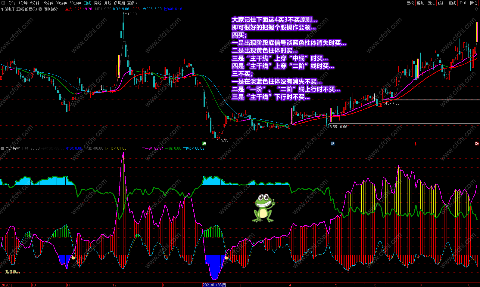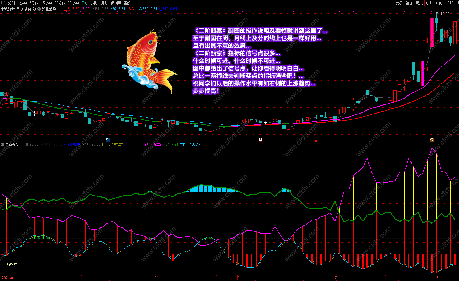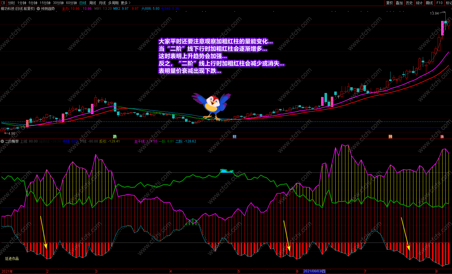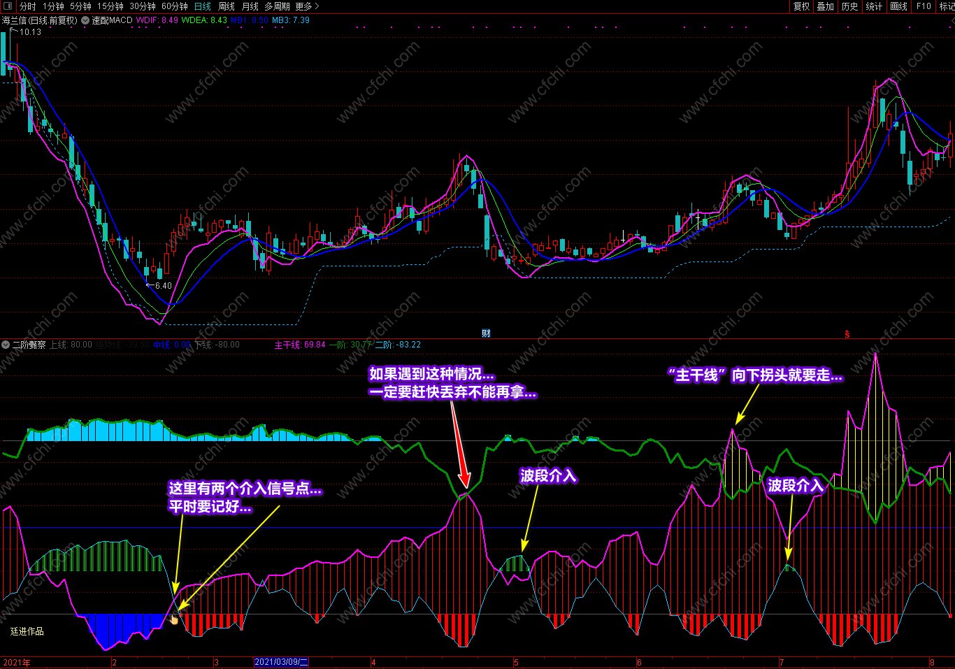 这次发表的《二阶甄察》副图指标,最大的突出点在于可以利用指标的多点信号及时把握个股的操作和进出,并利用颜色提示个股目前处在什么趋势,将来又如何去发展,什么时候可进,什么时候不该进,再配合附送的主图《预测趋势》,可以完美的对个股进行稳定操作。特别是副图中的多点信号和多点提示,对个股的操作是其它指标不可替代的。具体操作说明及要领已经在截图中进行了详解,这里不再复述。