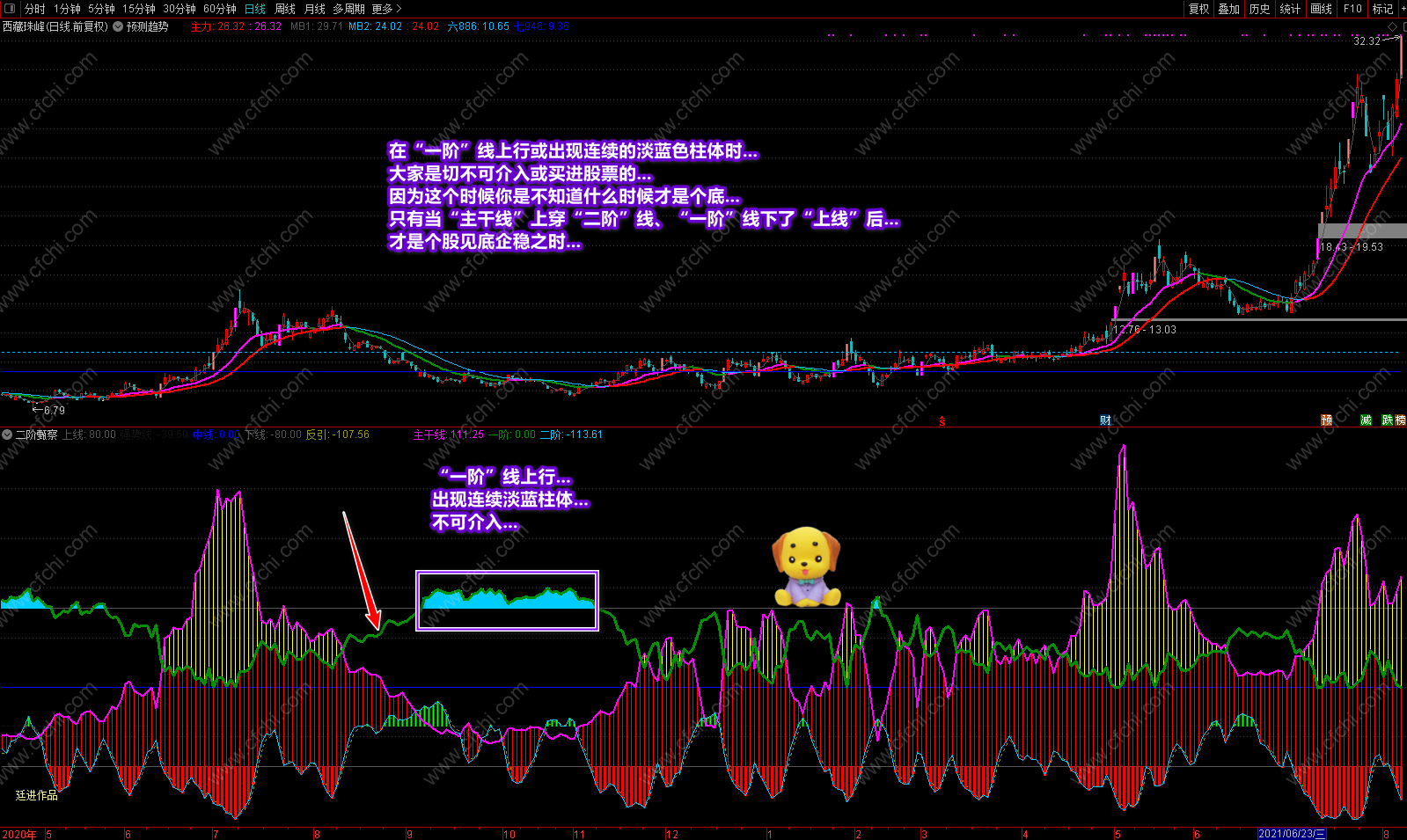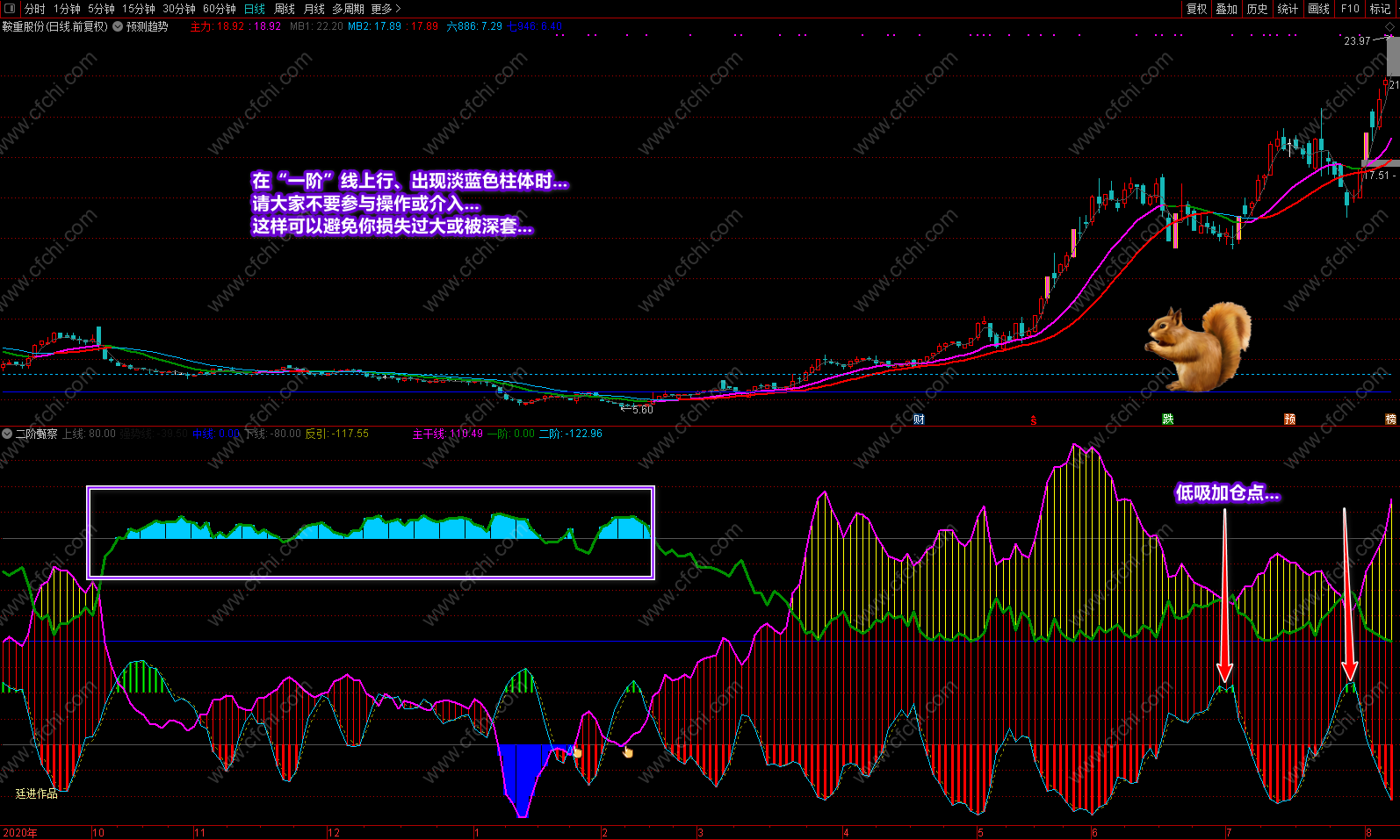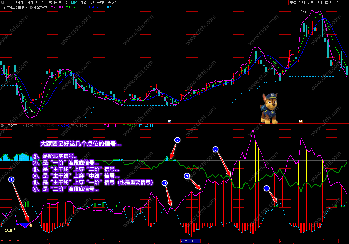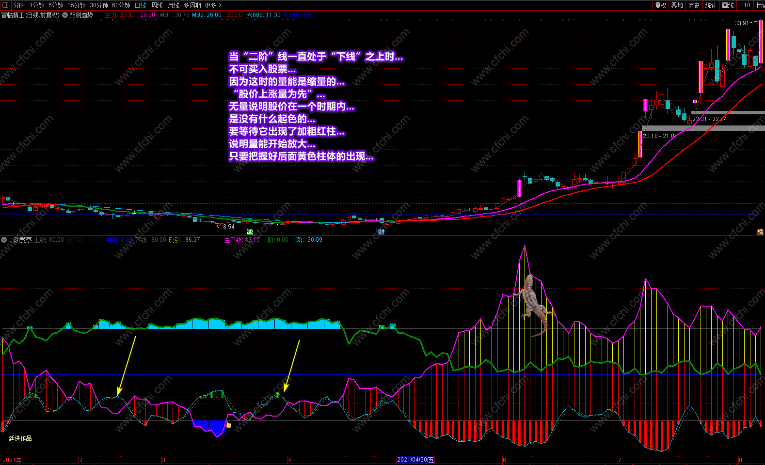 这次发表的《二阶甄察》副图指标,最大的突出点在于可以利用指标的多点信号及时把握个股的操作和进出,并利用颜色提示个股目前处在什么趋势,将来又如何去发展,什么时候可进,什么时候不该进,再配合附送的主图《预测趋势》,可以完美的对个股进行稳定操作。特别是副图中的多点信号和多点提示,对个股的操作是其它指标不可替代的。具体操作说明及要领已经在截图中进行了详解,这里不再复述。