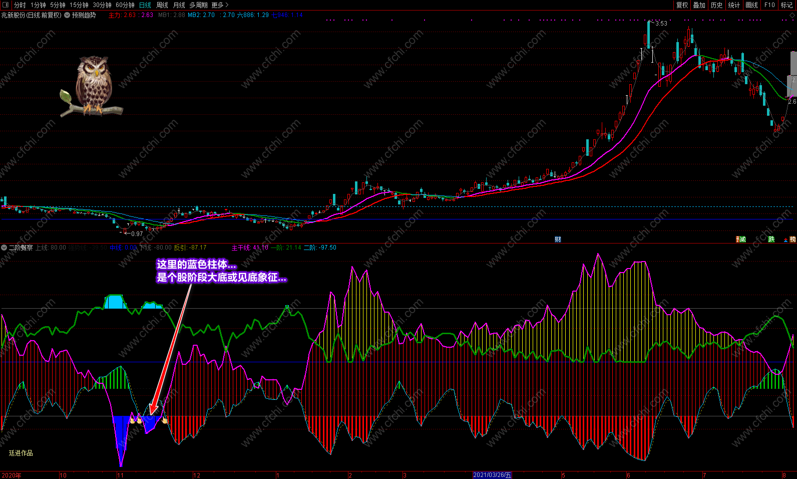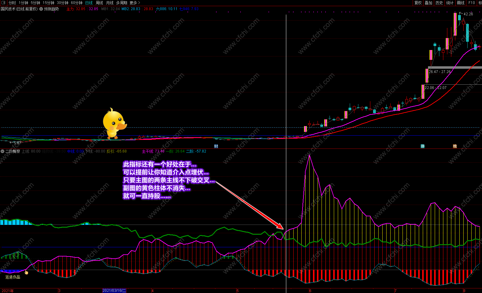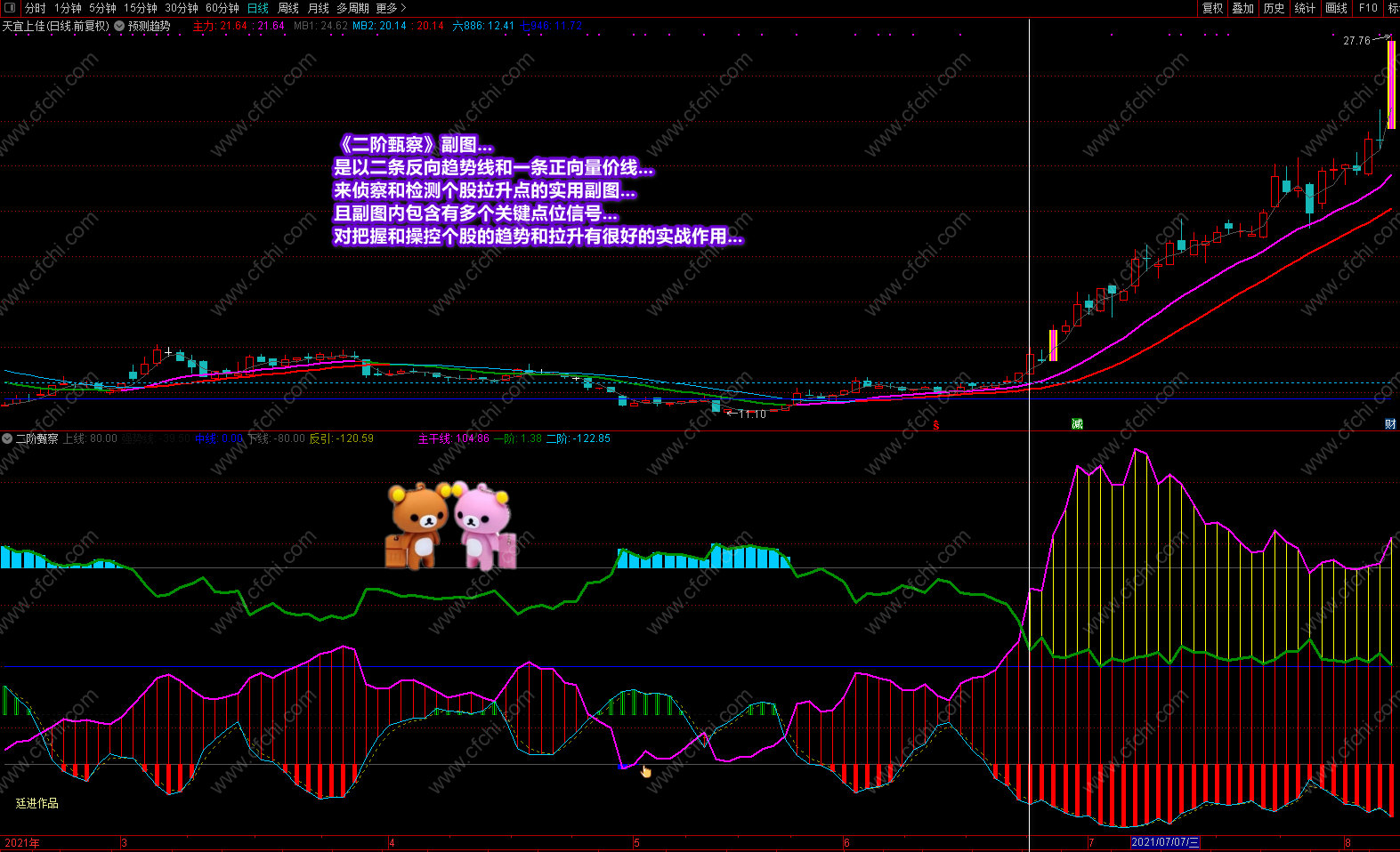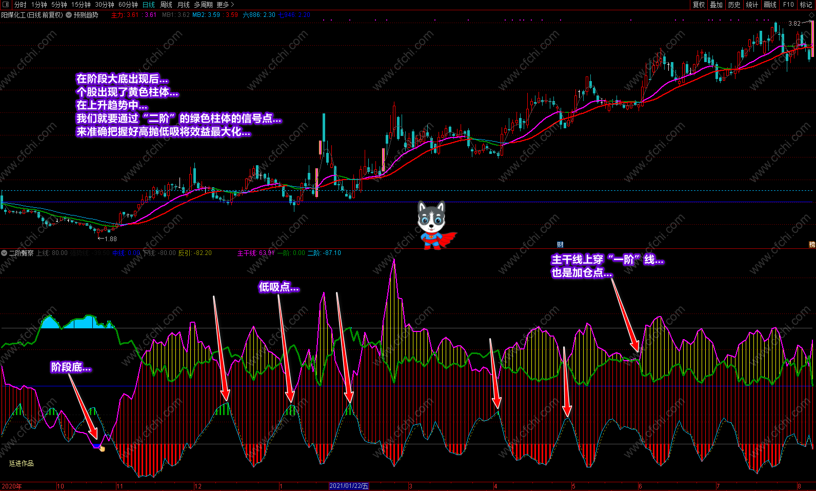 这次发表的《二阶甄察》副图指标,最大的突出点在于可以利用指标的多点信号及时把握个股的操作和进出,并利用颜色提示个股目前处在什么趋势,将来又如何去发展,什么时候可进,什么时候不该进,再配合附送的主图《预测趋势》,可以完美的对个股进行稳定操作。特别是副图中的多点信号和多点提示,对个股的操作是其它指标不可替代的。具体操作说明及要领已经在截图中进行了详解,这里不再复述。