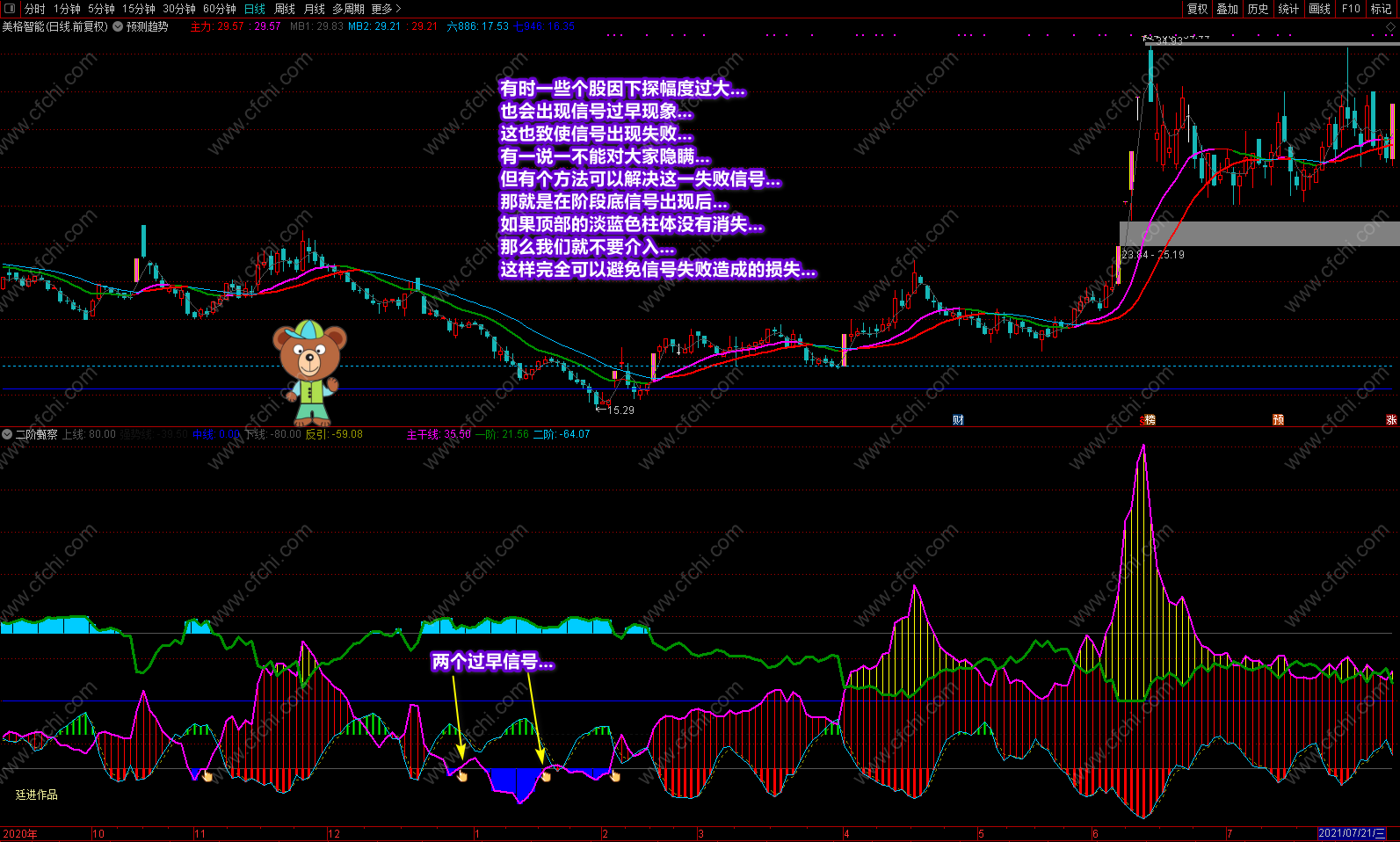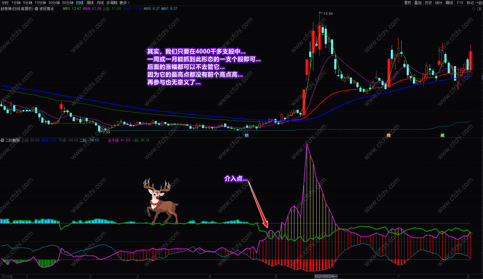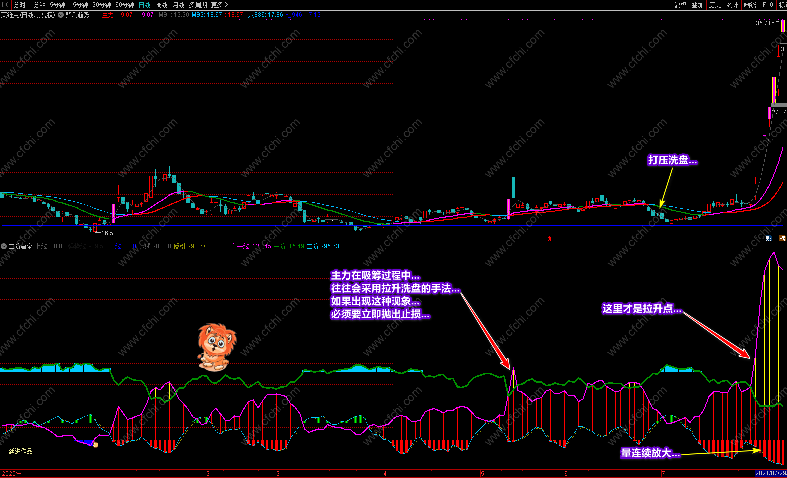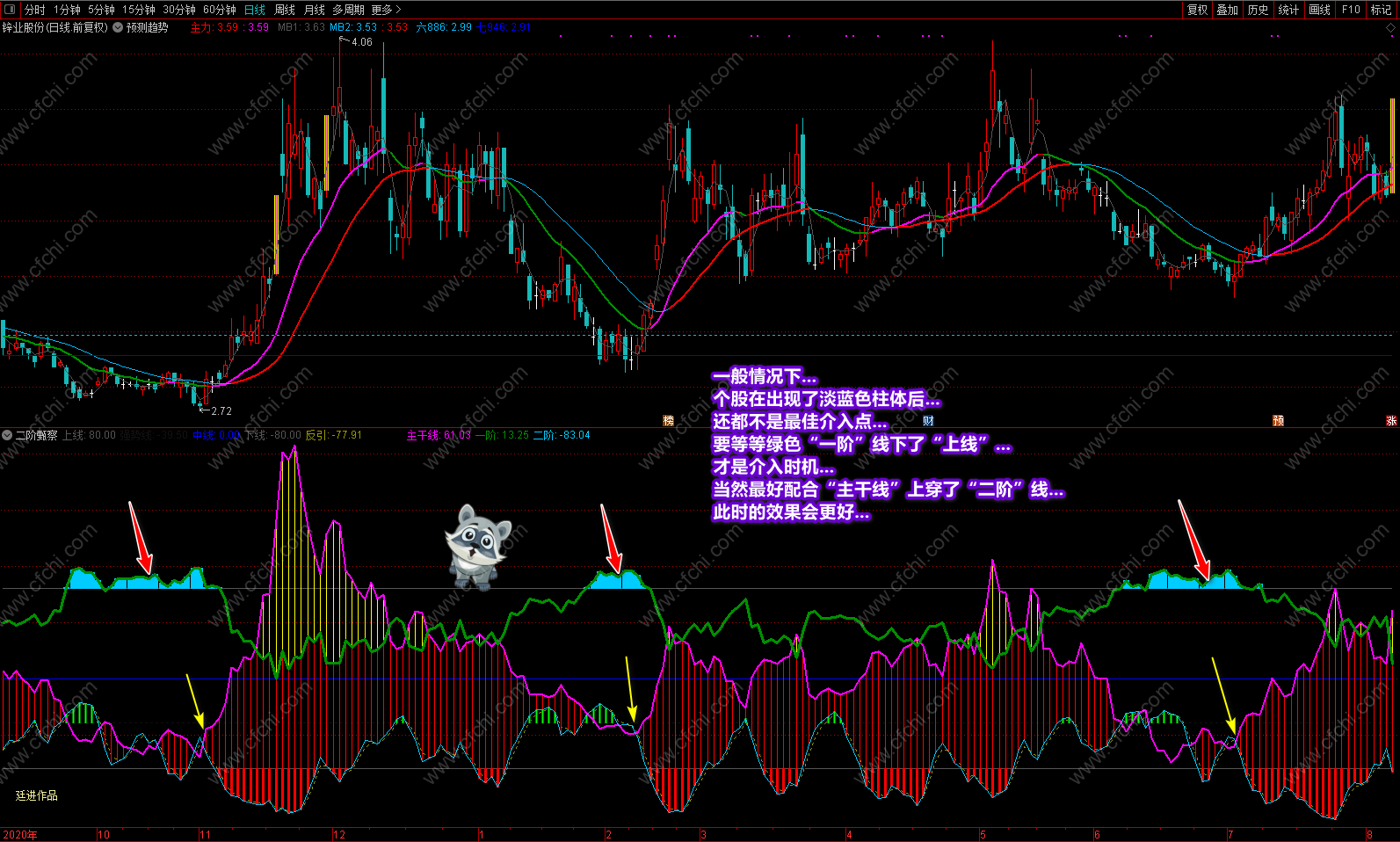 这次发表的《二阶甄察》副图指标,最大的突出点在于可以利用指标的多点信号及时把握个股的操作和进出,并利用颜色提示个股目前处在什么趋势,将来又如何去发展,什么时候可进,什么时候不该进,再配合附送的主图《预测趋势》,可以完美的对个股进行稳定操作。特别是副图中的多点信号和多点提示,对个股的操作是其它指标不可替代的。具体操作说明及要领已经在截图中进行了详解,这里不再复述。