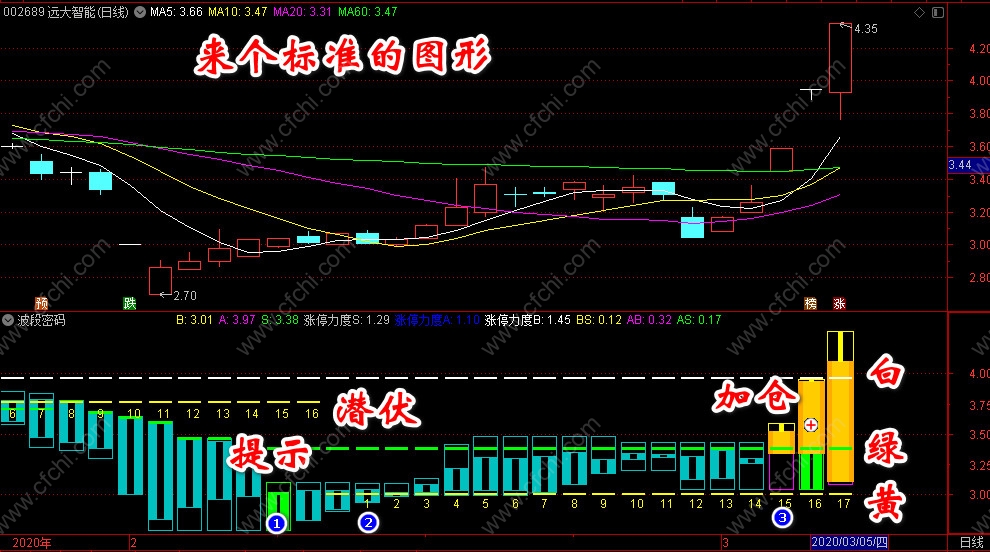 2、当K线在同一天突破这三根线的时候且当日涨幅大于4%,我们定义为站稳三线大阳,意味着股价走势启动。