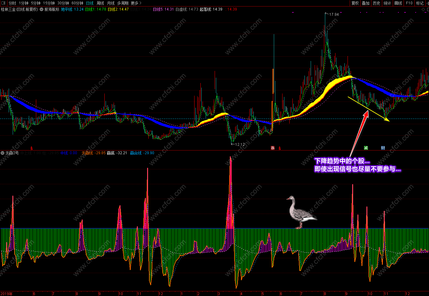 至于《天赢2号》作为《天赢1号》的优化改良版,是经过多日实战操作反复比对实际点位写成的又一个信号类指标,可以说大小波段通吃,不管是小信号还是大信号都有一定的实际涨幅。《天赢1号》作为早期单一的大信号提示,还是让一些同学觉得它是一个很好用的指标,《天赢2号》经过改良使个股中在波段低位的信号都可以比较准确的提示出来,使你手中现有的被套或亏损个股看到了希望。只要你结合短线指标做好低进高出,就可以很好的减少损失。