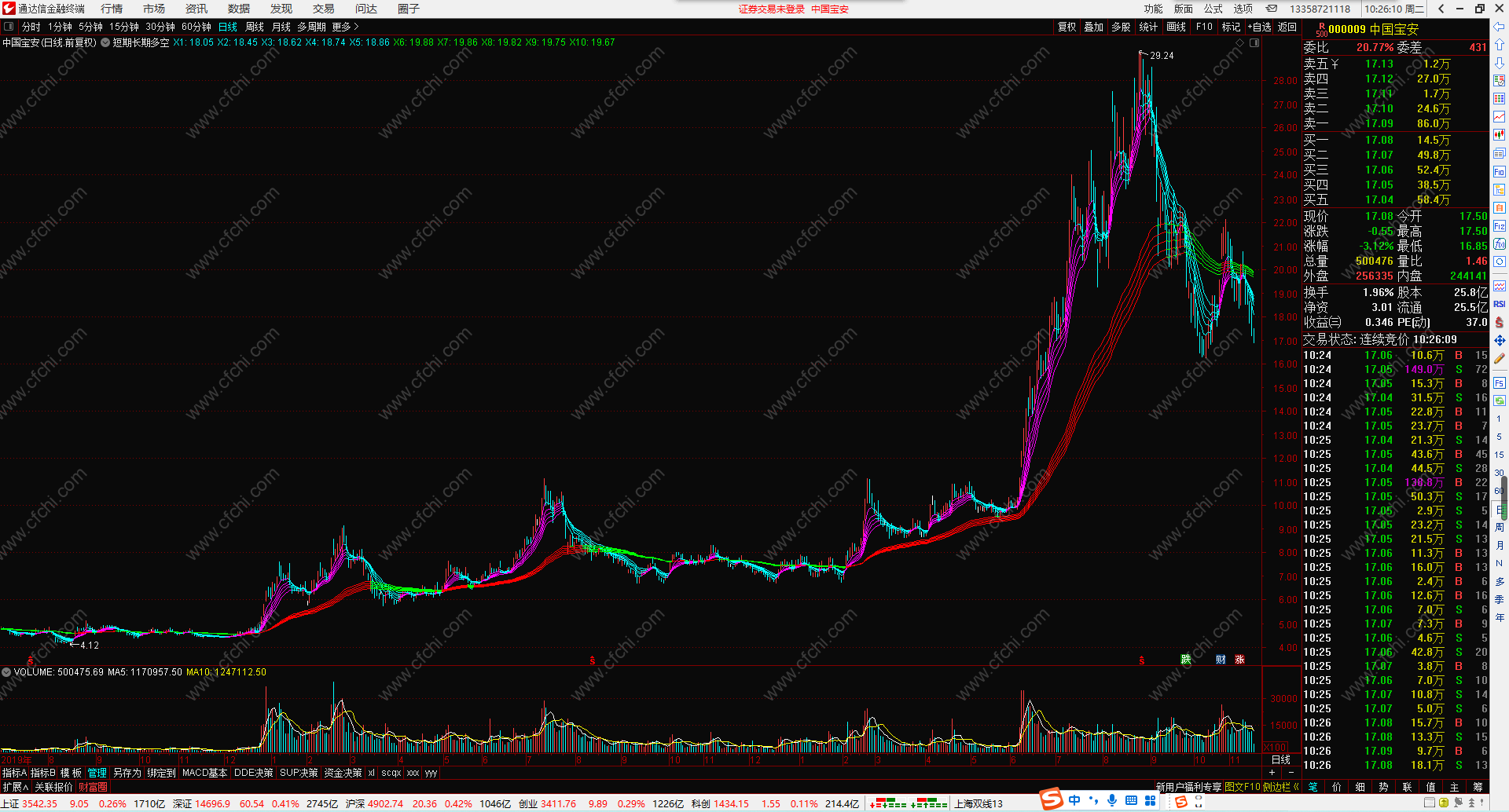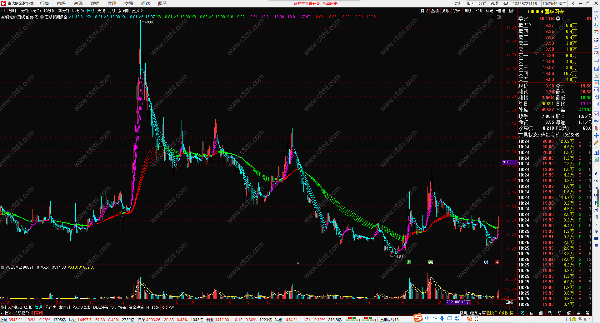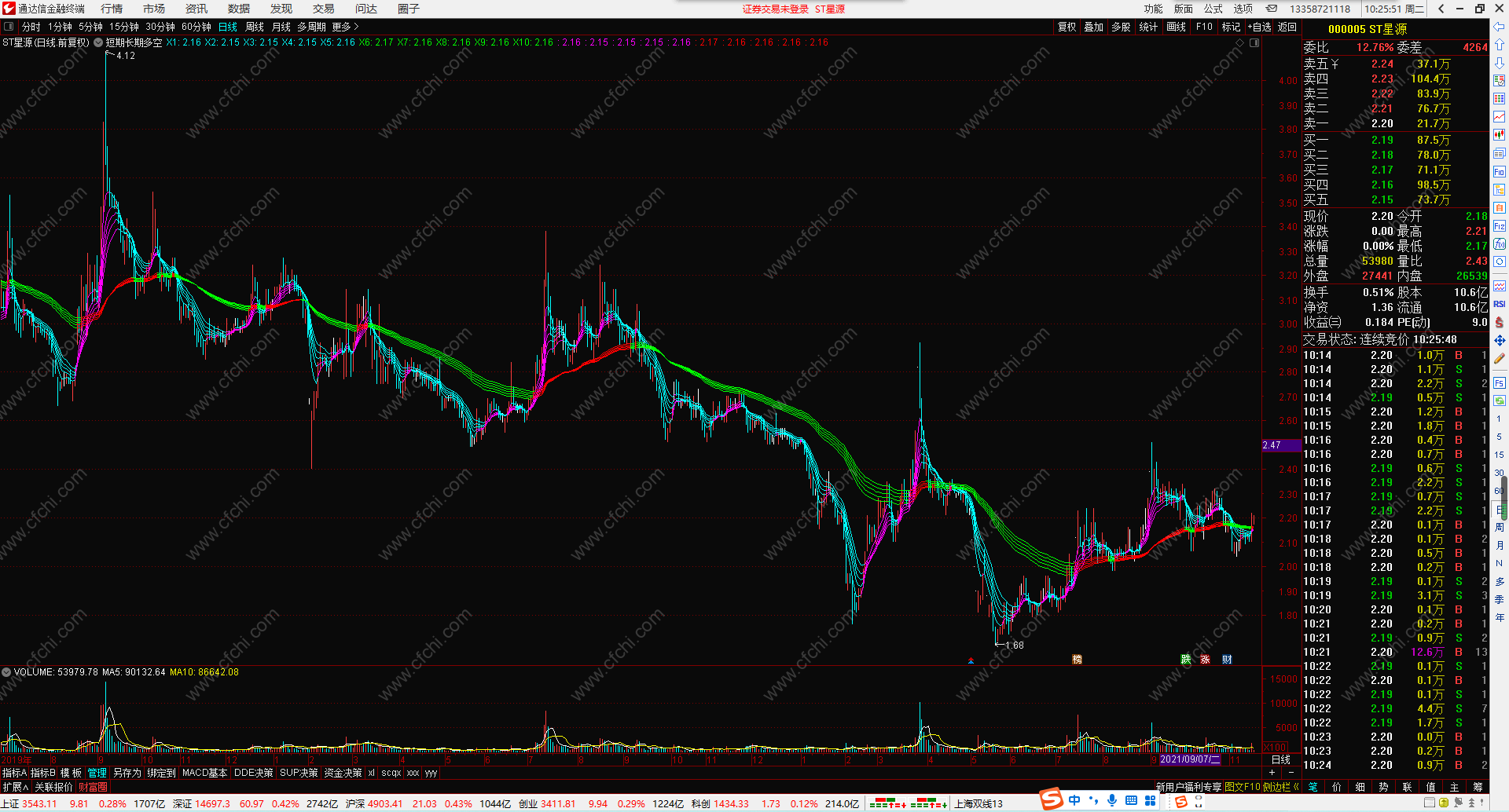 当多根趋势线同时显示青色时候代表短期处于空头趋势,