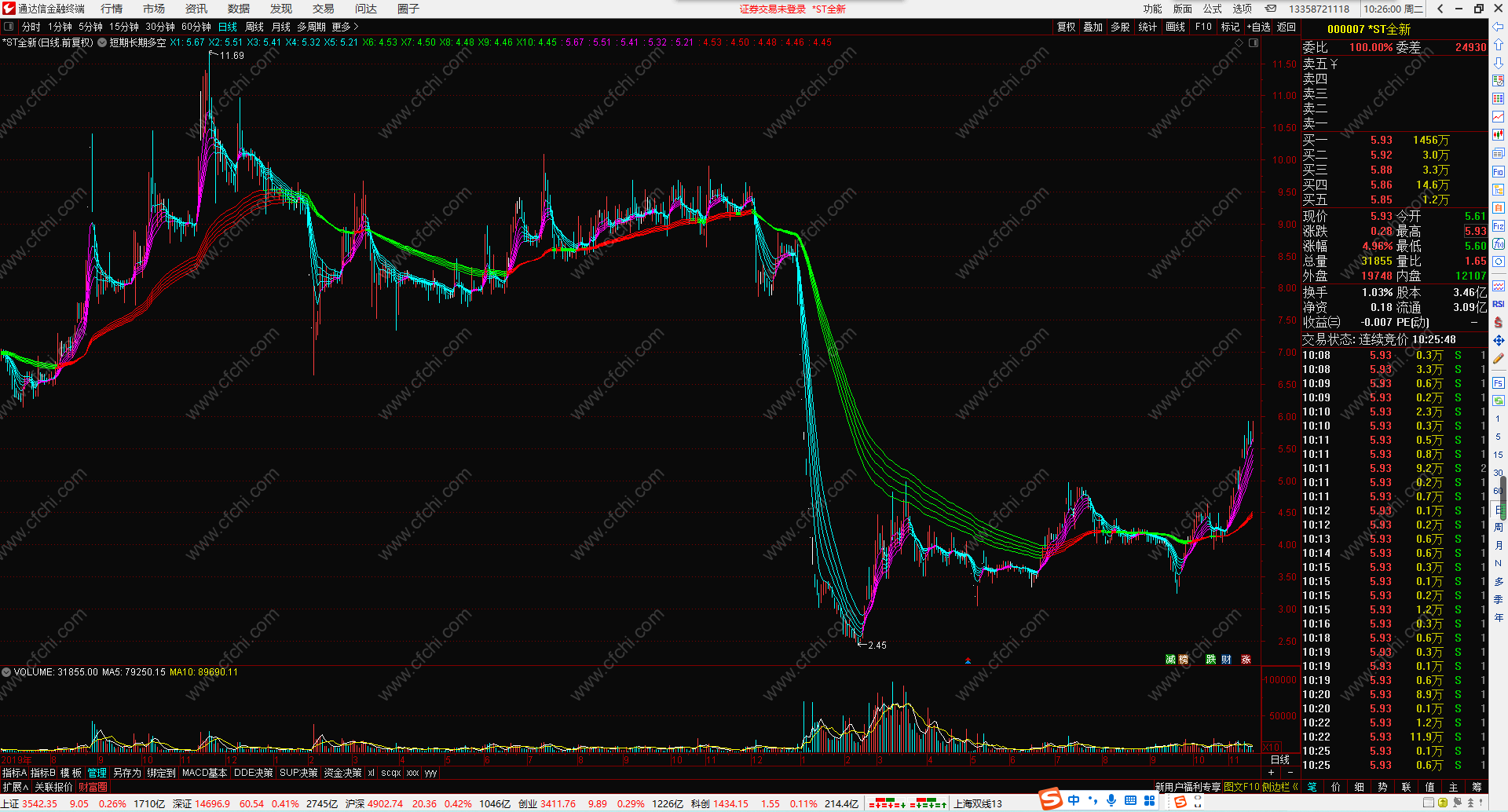 当多根趋势线同时显示洋红色时候代表短期趋势处于多头趋势,