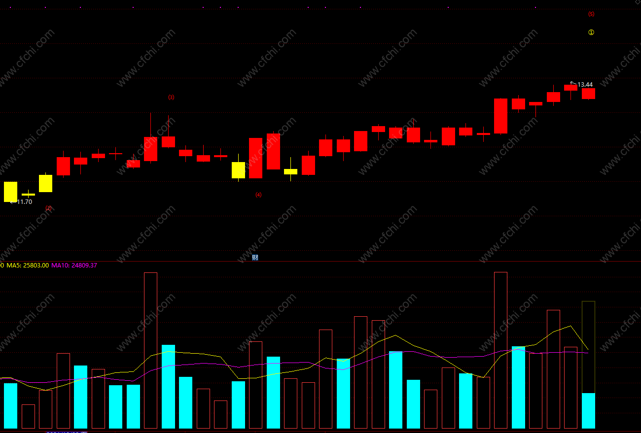 DRAWTEXT(EX2 AND PL20>REF(PL20,1) AND ZTJD10=2,H*1.06,'③'),LINETHICK3,COLOR00FFFF;