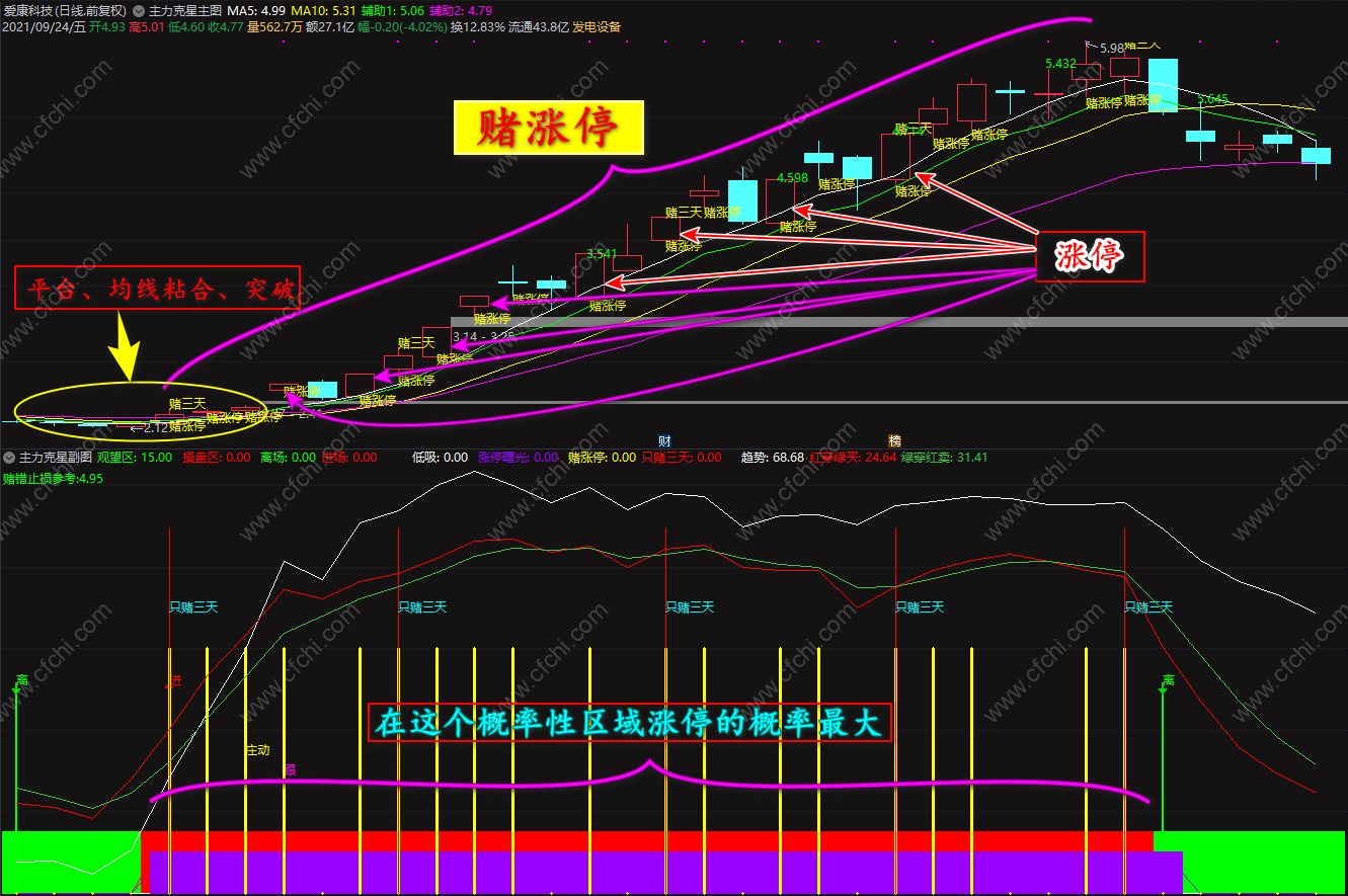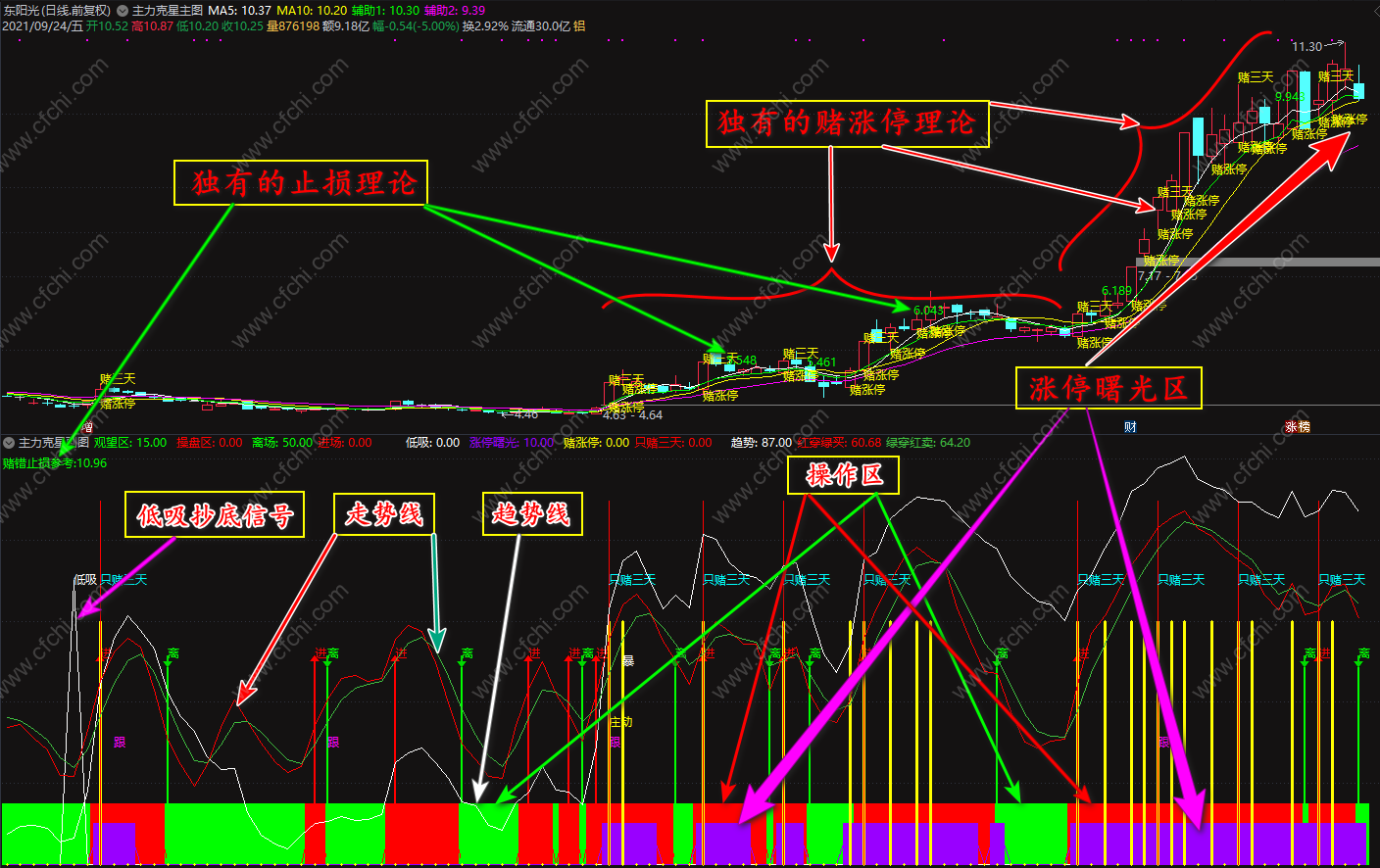有红绿色块的操作区提示,有红白绿线的走势线,有低吸二字提示长期下跌后抄底信号提示。涨停曙光紫色色块是概率性区域提示,这个区域出现涨停的概率要比非紫色区域高但不代表一定必须有涨停所以叫曙光。还有红箭头和绿箭头进离场信号提示。等等!!