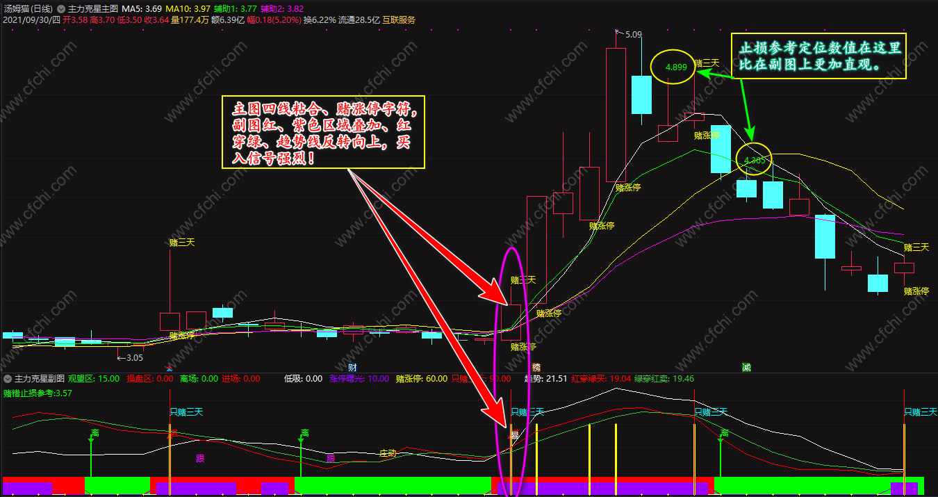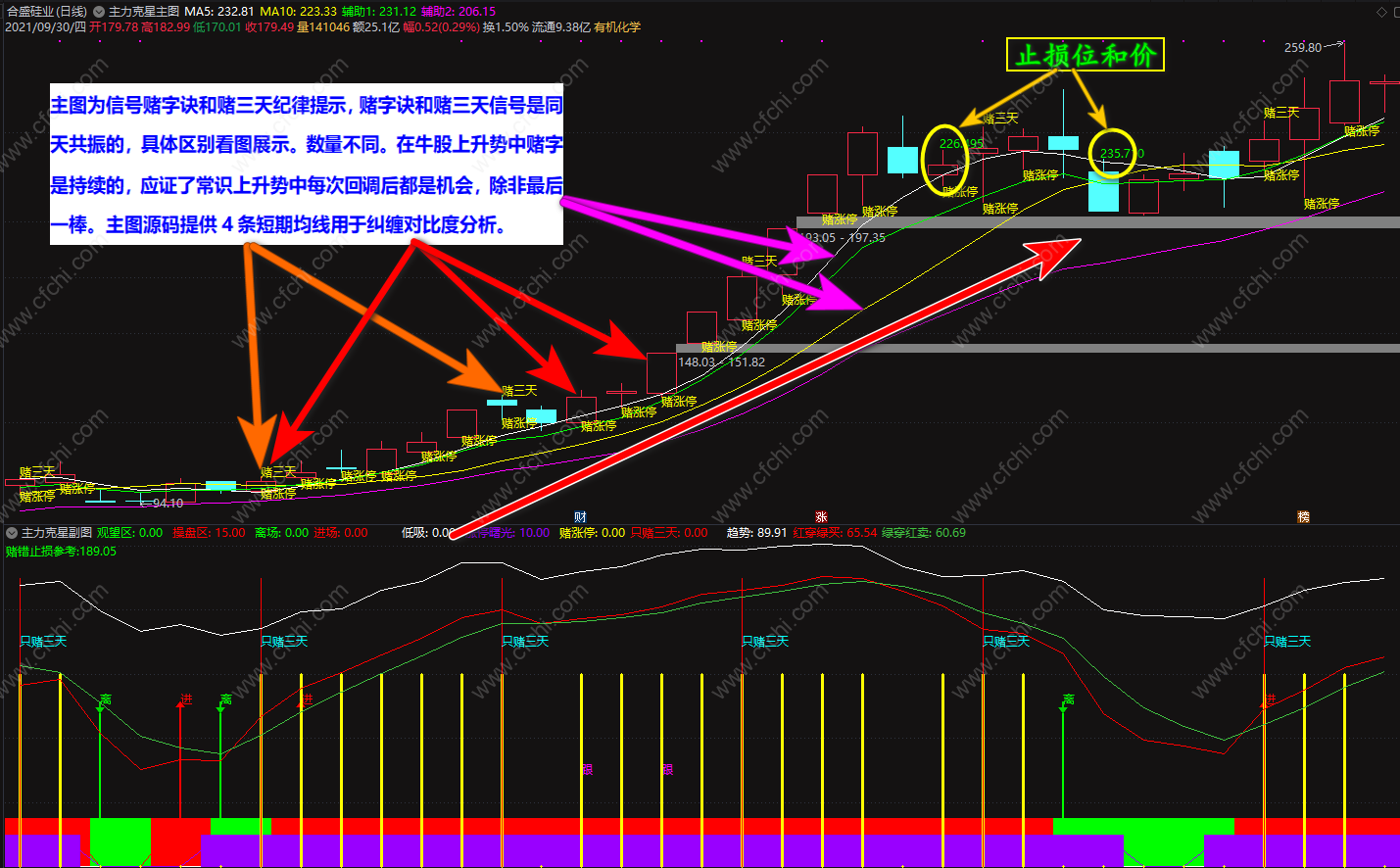 6)主图为信号赌字诀和赌三天纪律提示,赌字诀和赌三天信号是同天共振的,具体区别看图展示。数量不同。在牛股上升势中赌字是持续的,印证了常识上升势中每次回调后都是机会,除非最后一棒。主图源码提供4条短期均线用于纠缠对比度分析。如果你习惯自己的主图可以直接复制源码或减少部分源码粘贴到你自己习惯的主图上去,这也是我们提供源码给大家的初衷,方便订阅者自行借鉴共享思路自行探索优化找到适合自己的方法。