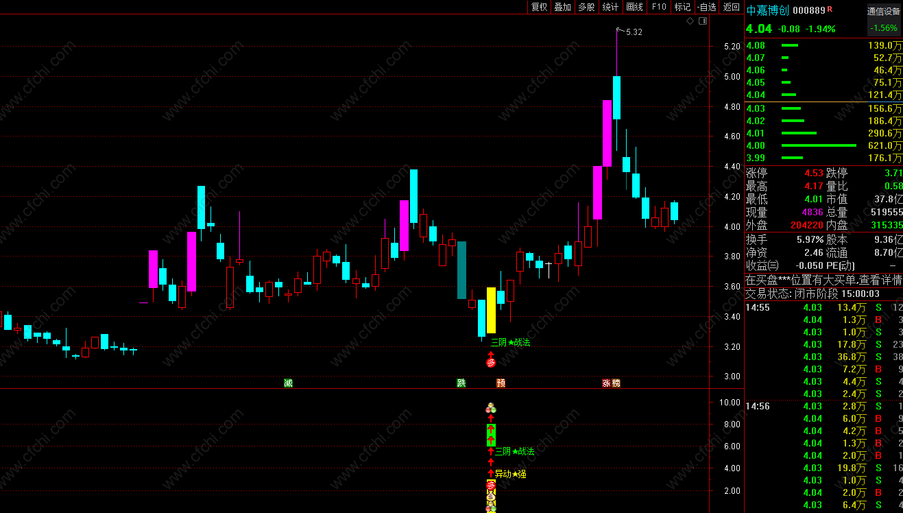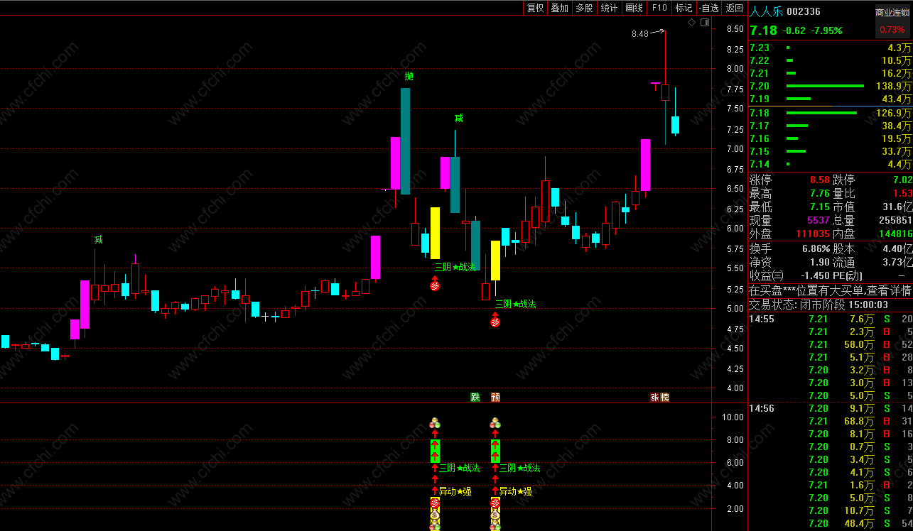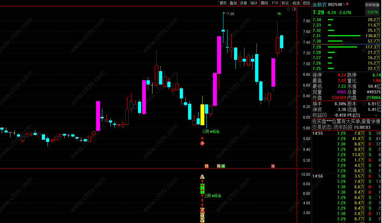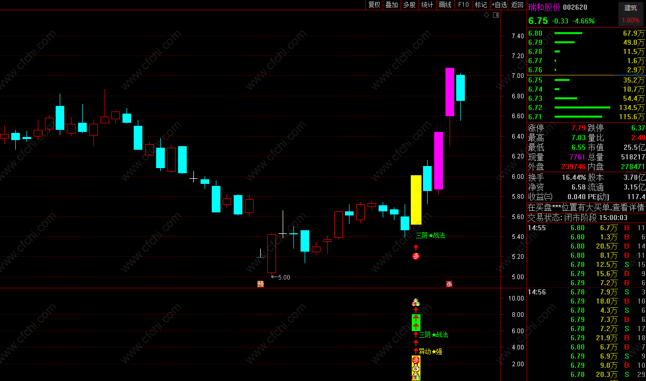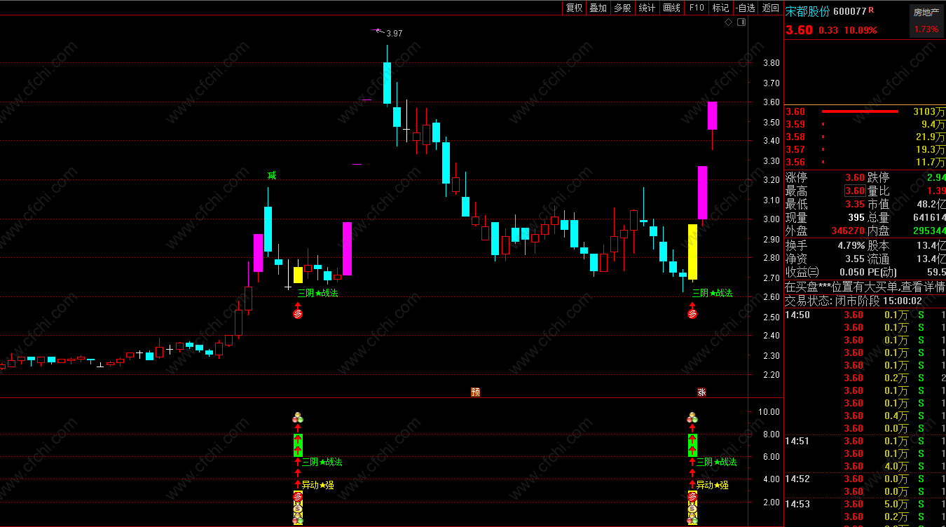 功能介绍:本指标是一款以自动判断主力 最近持续阴线洗盘结束后 捕捉的 三阴战法信号介入点提示 采集设计增加了自动过滤近期市场弱势股 与 不活跃股的功能 更佳体现出 适用于:短线操作风格 短周期内预报打板 与 短期强势大幅度拉伸。