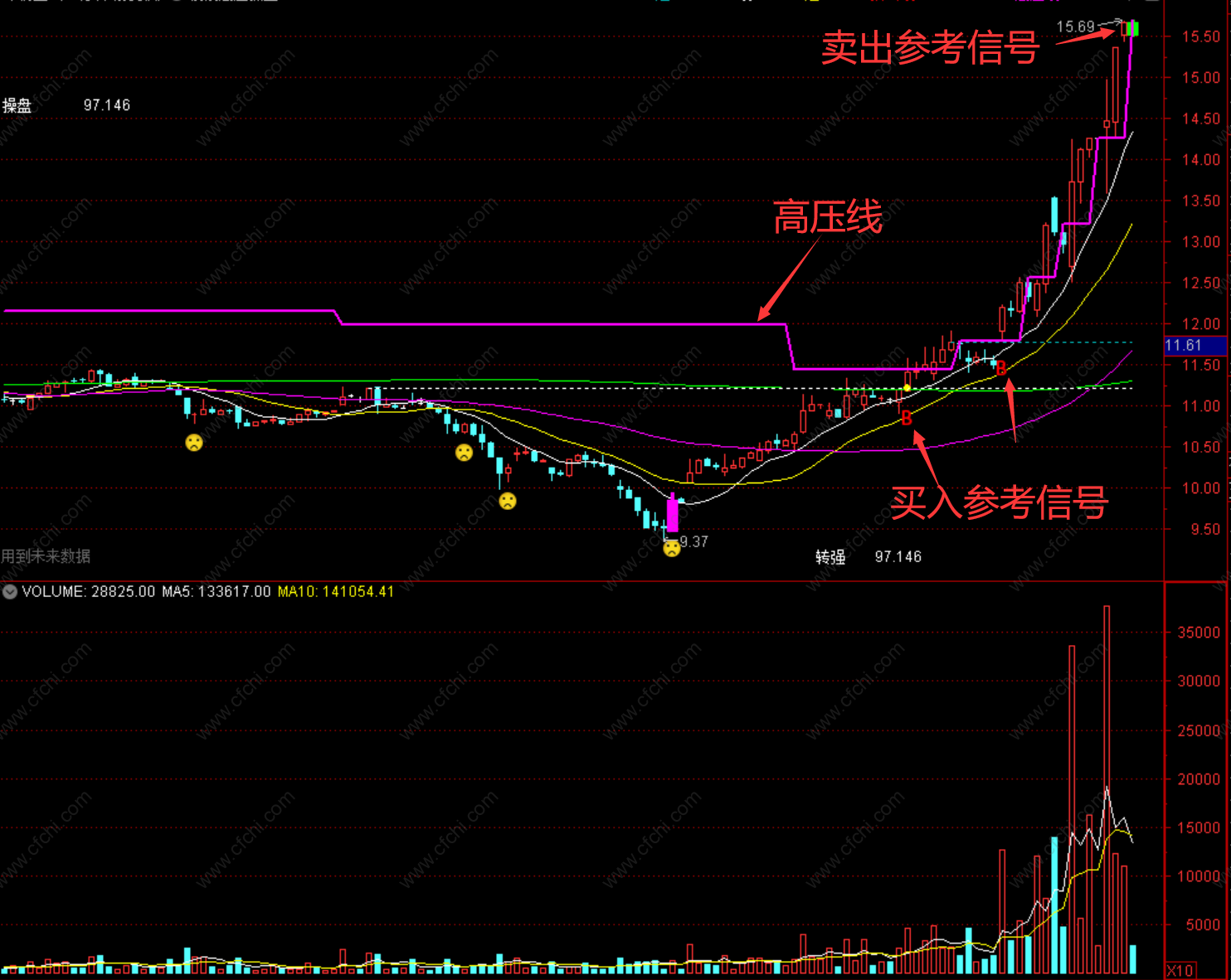 1、紫色信号线是高压线,B信号是参考买入信号,绿色信号柱是参考卖出信号