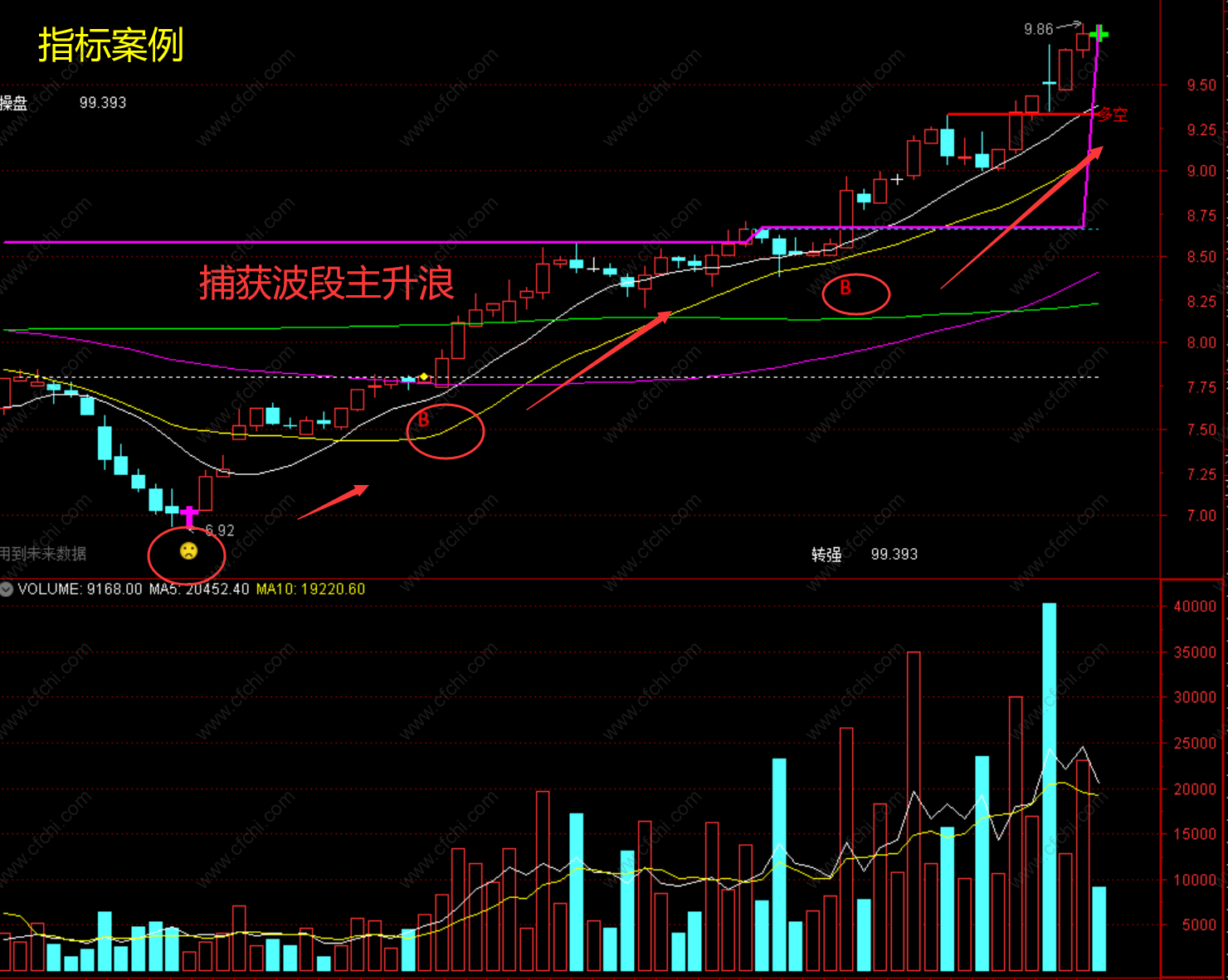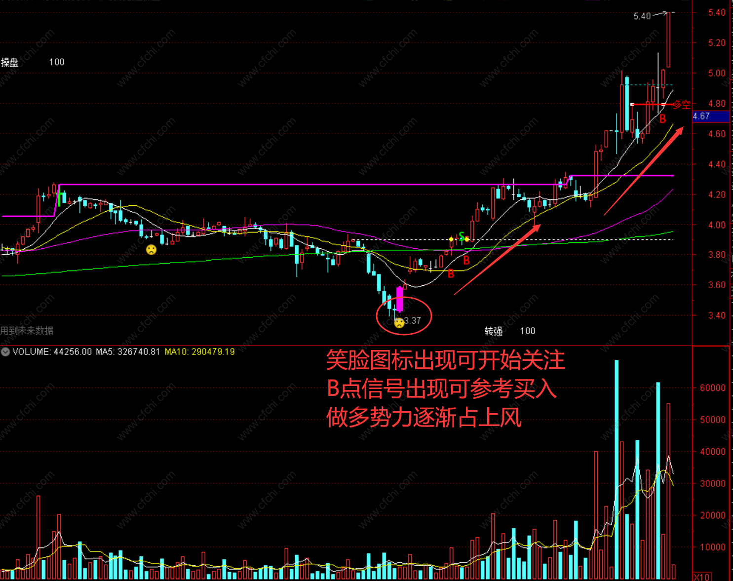 2、出现紫色的信号可开始关注,波段行情即将启动,当出现B信号,做多势力占优势,此时可参考买入