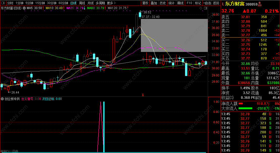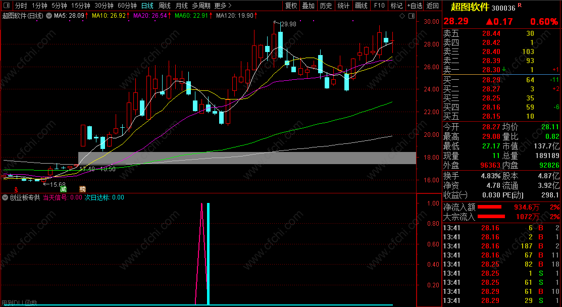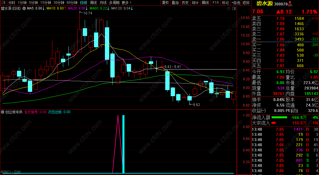 1、【创业板专供】指标副图洋红色三角形是当天信号,淡蓝色柱子“次日达标”信号指示默认设定0.9个点以方便大家观察,其他达标点位不显示。如果不幸止损可自行设定3个点或者5个点附近。