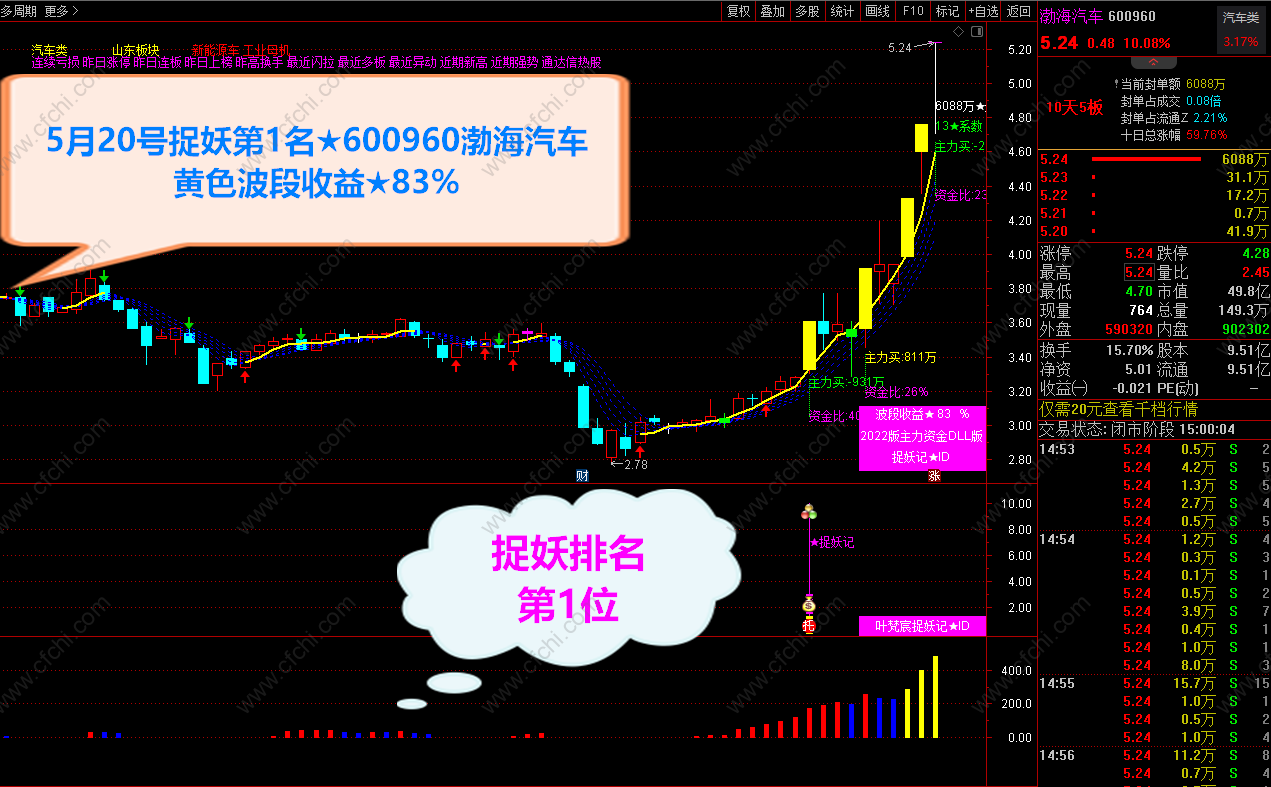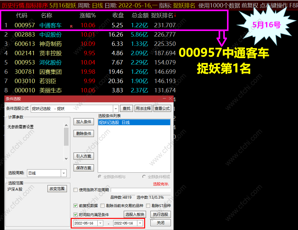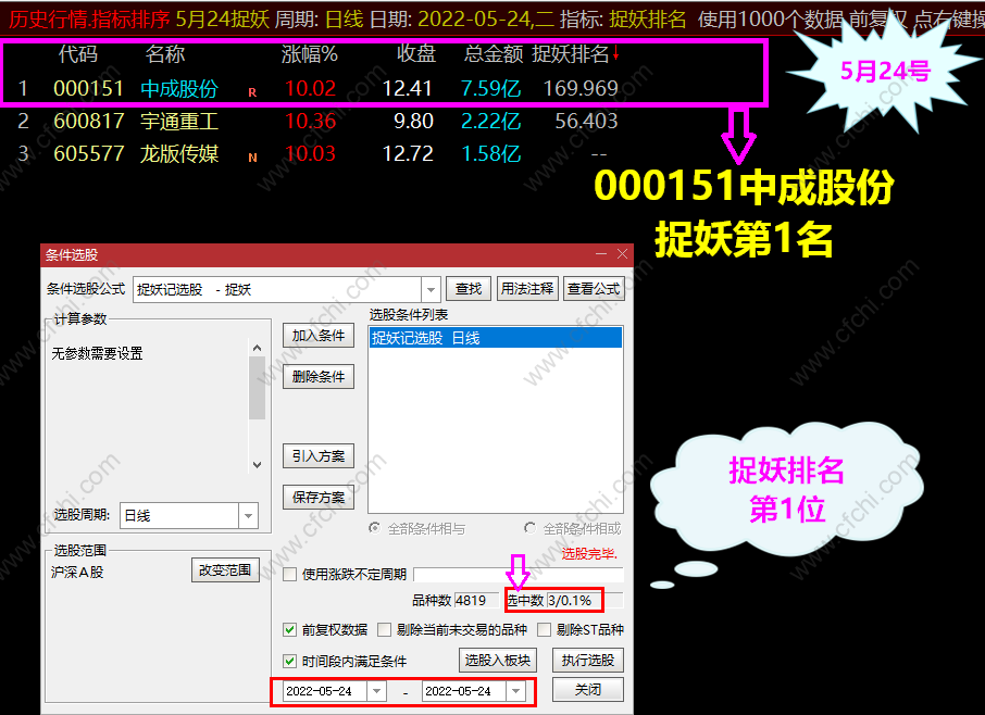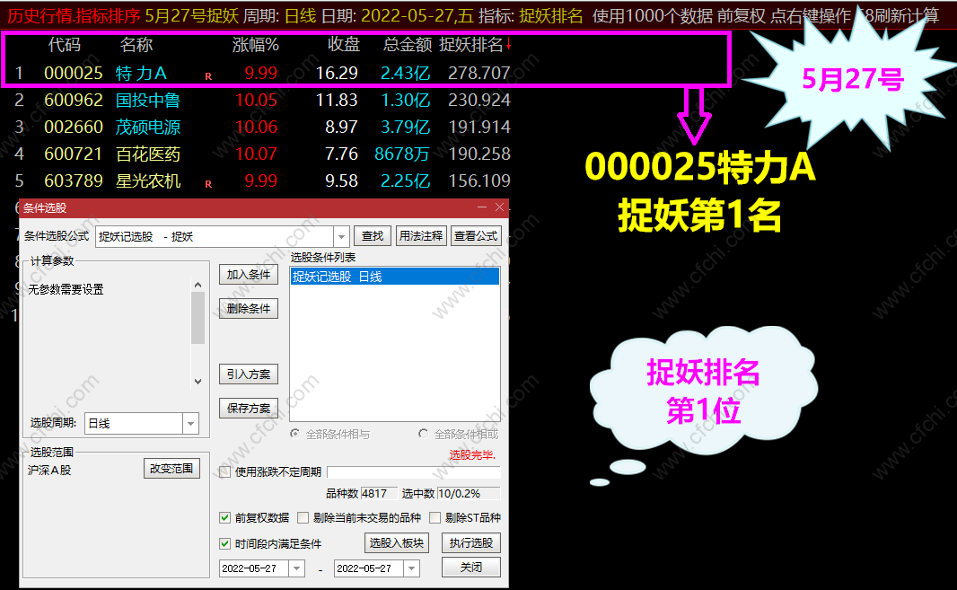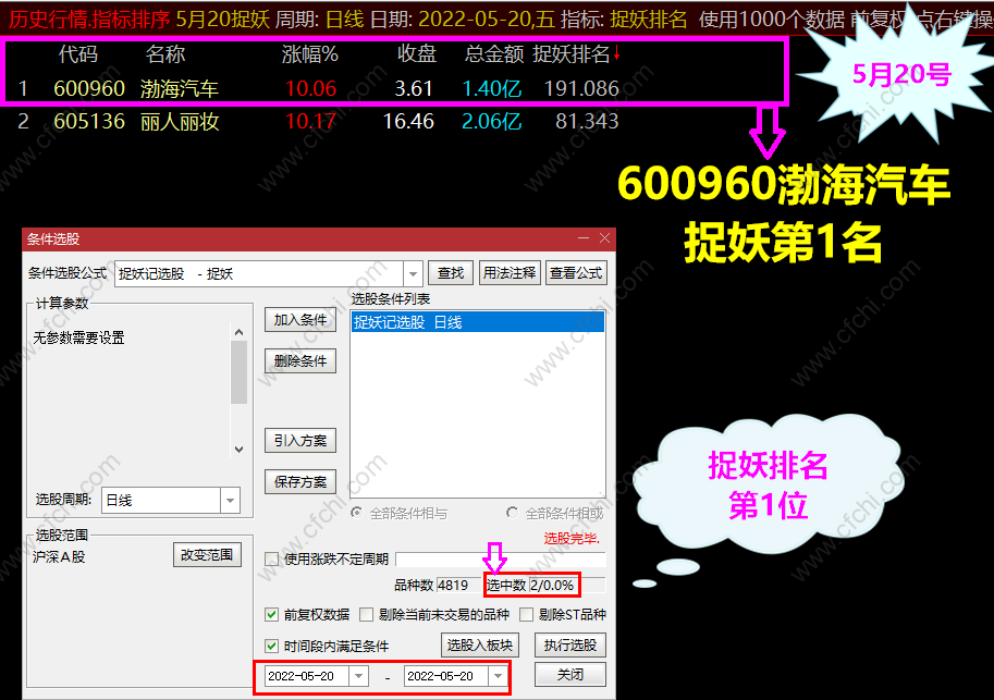 捉妖排名: 捉妖记选股 选出当天符合条件个股 进入一个专用板块 捉妖信号打分排名 计算出 当前最具潜力成妖的个股 进行跟踪操作(选股无优 选取捉妖排名第1名 个股)