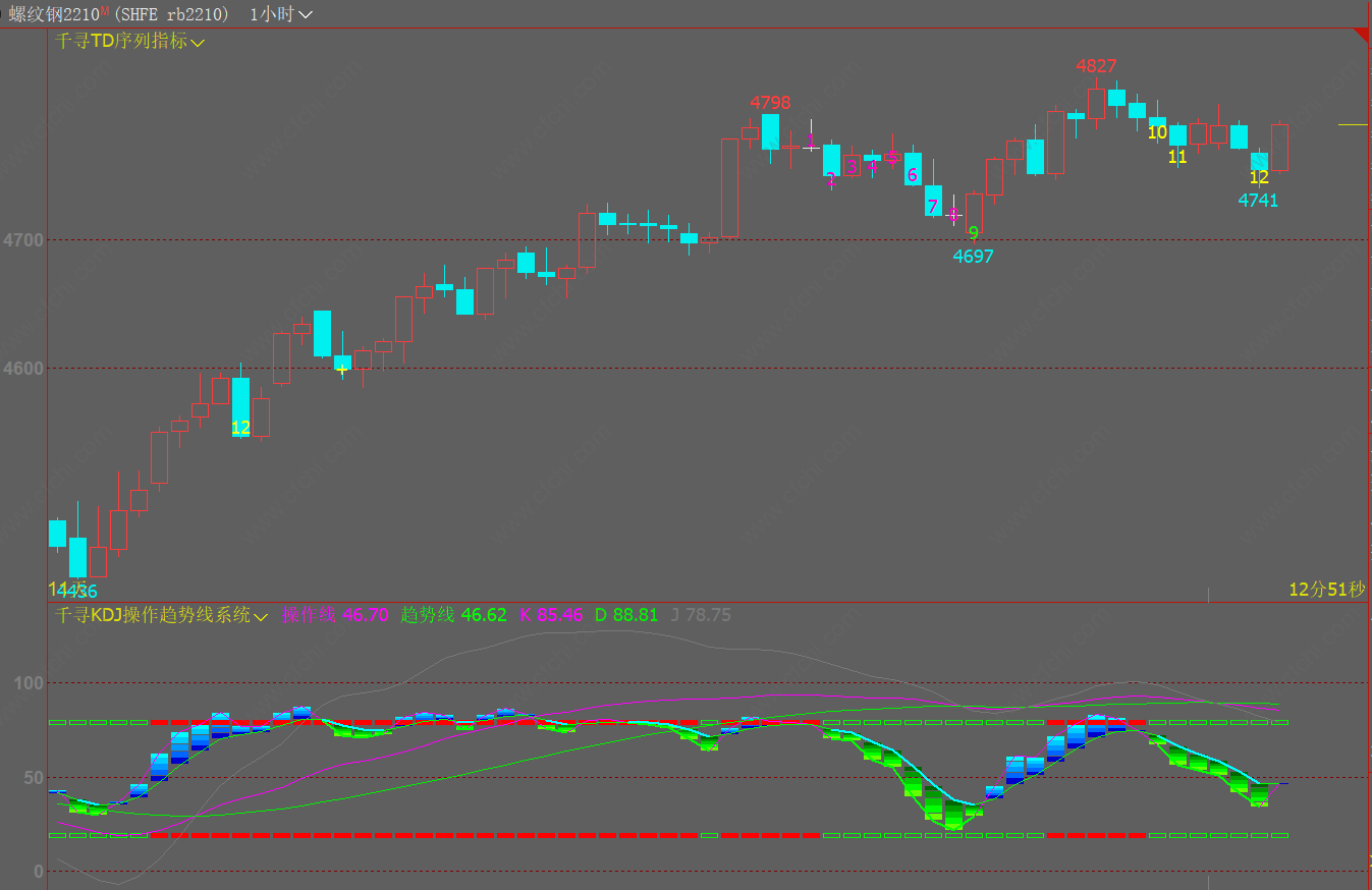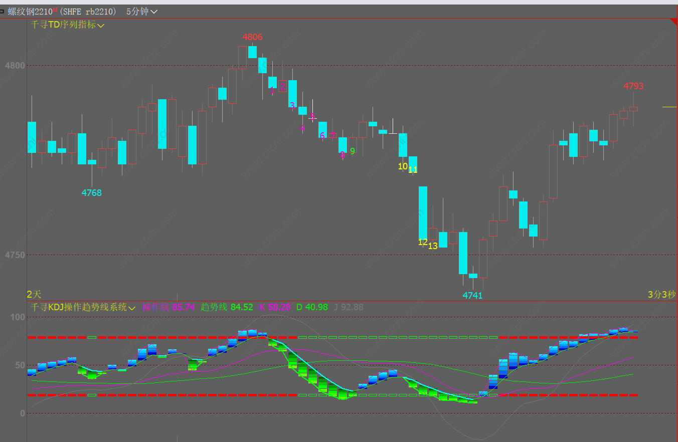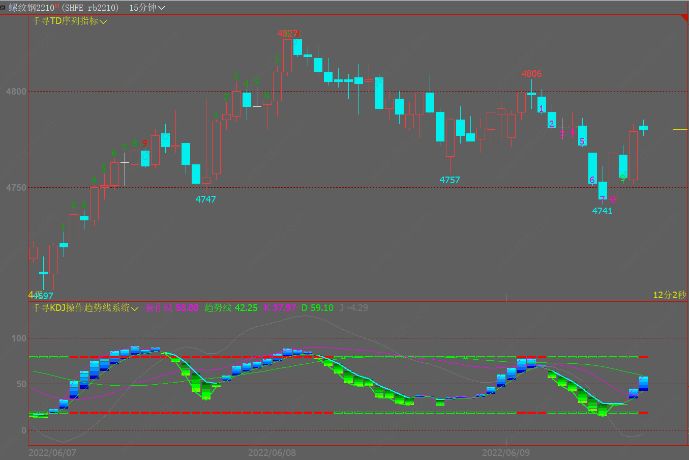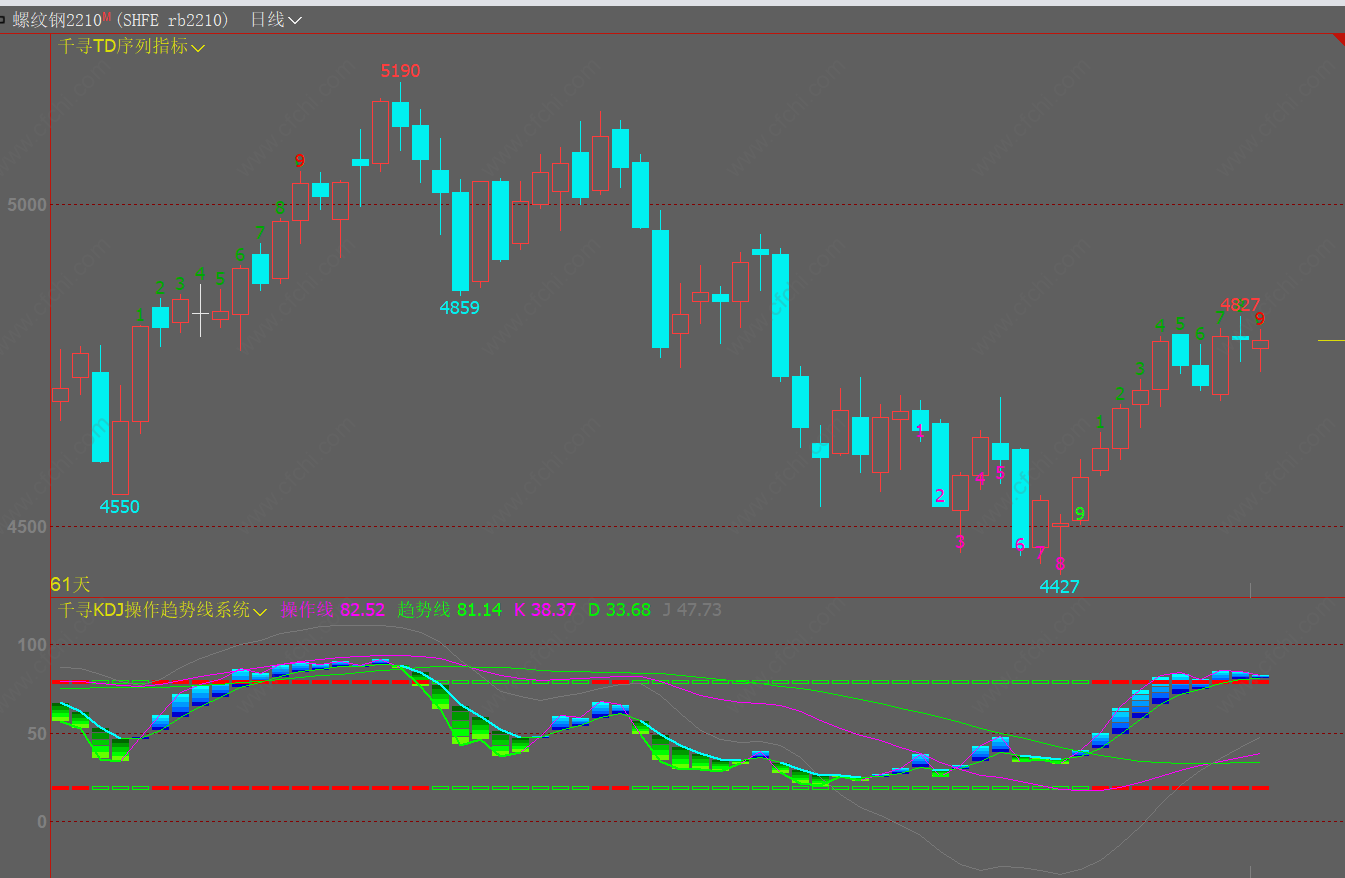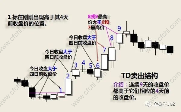 狄马克的交易系统包含上百个指标,其中应用最广泛的就是TD序列。TD序列的原理是,当价格持续下跌时连续出现的九根K线,这些K线的收盘价都比各自前面的第四根K线的收盘价低,就在其K线下方标记相应的数字(通常为1-13),最后1根就标记为9或13,当出现9或13时,大概率会出现价格反弹;反之,当价格持续上涨,此时TD出现9或13,则大概率会出现回调下跌的情况。如果途中出现中断,则计数作废,重新数K线。