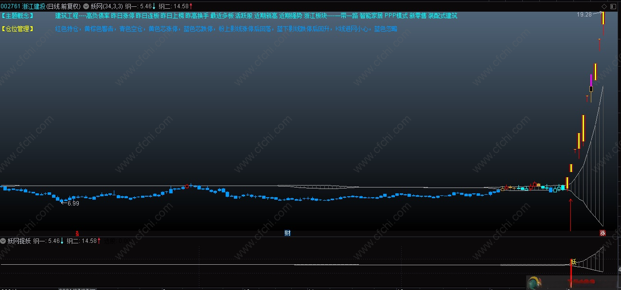 【仓位管理】红色持仓,黄棕色警告,青色空仓,黄色芯涨停,蓝色芯跌停,粉上影线涨停后回落,蓝下影线跌停后回升,K线进网小心,蓝色忽略。(遵纪守律请牢记,)