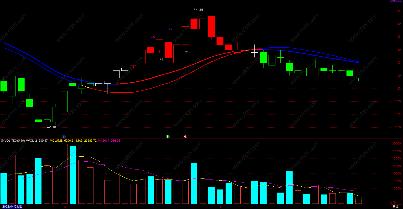 DA:=(EMA(C,1)+EMA(C,2)+EMA(C,3)+EMA(C,4))/4; DB:=(EMA(C,10)+EMA(C,20)+EMA(C,40)+EMA(C,80))/4; DRAWTEXT(CROSS(DA-DB,0),L*0.98,'★B'),colorgray; JH:=SMA(MAX(C-REF(C,1),0),5,1)/SMA(ABS(C-REF(C,1)),5,1)*100; DRAWTEXT(CROSS(84,JH),H*1.02,'☆S'),colormagenta; 涨停:=IF((C-REF(C,1))*100/REF(C,1)>=(10-0.01*100/REF(C,1)),1,0); STICKLINE(涨停,O,C,2,0),colorred; 跌停:=IF((REF(C,1)-C)*100/REF(C,1)>=(10-0.01*100/REF(C,1)),1,0); STICKLINE(跌停,O,C,2,1),colorgreen;