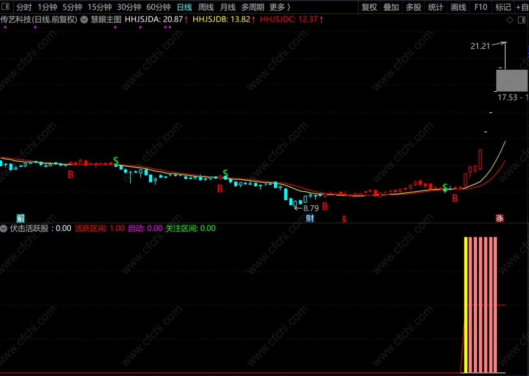伏击活跃股,用过益盟软件的股友都知道它的大名,意思是提前潜伏股票的活跃区域,大概率捕捉股价的拉升段或主升段,是典型的吃鱼吃鱼身的鱼身战法类指标,用启动信号选股,与主图正好出B点,或B点区域共振,效果非常良好,尤其在牛市的氛围里,超级牛。。。。