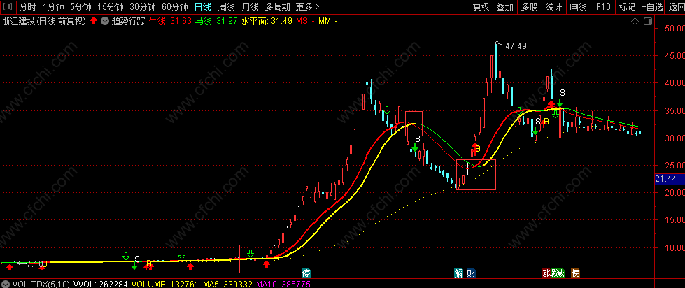 2.在下跌趋势过程,绿色的马线出现,寓意就非常明确了,我们要像马一样快的速度离场。同时牛线没有,但他的轨迹依然存在,线条变细