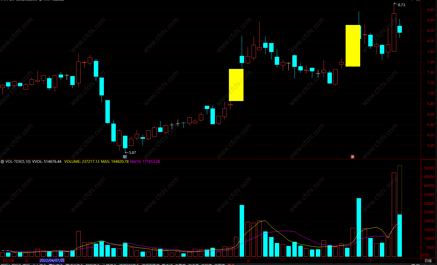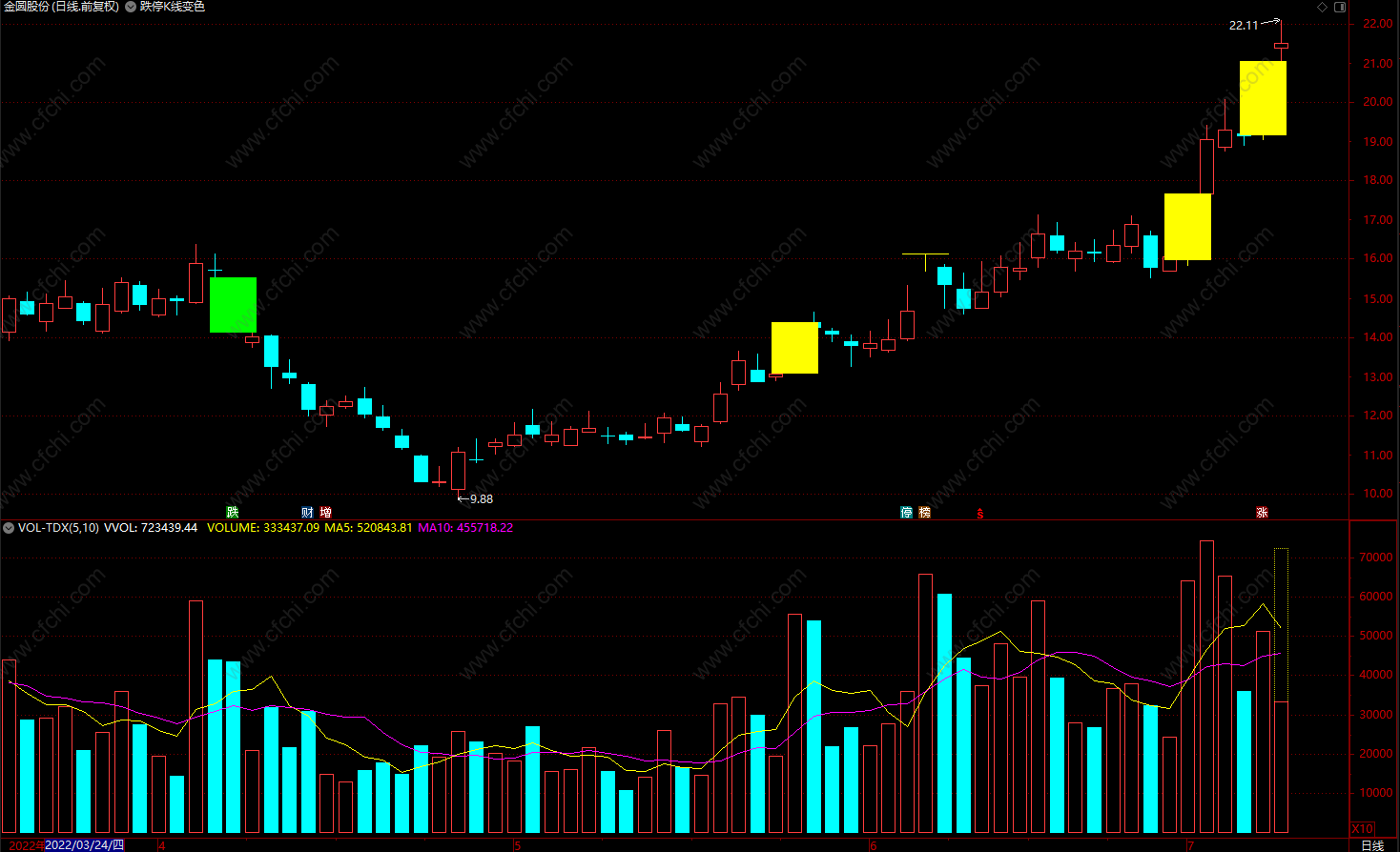 叠加主图显示,涨停板显示黄色,跌停板显示绿色。