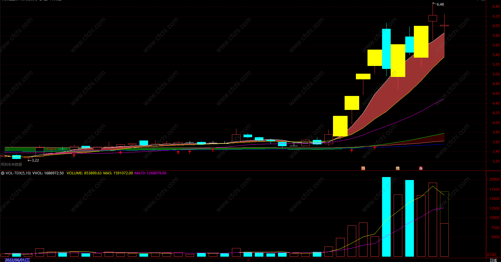 买点:红色箭头、红色波段、上涨趋势,黄柱追涨!