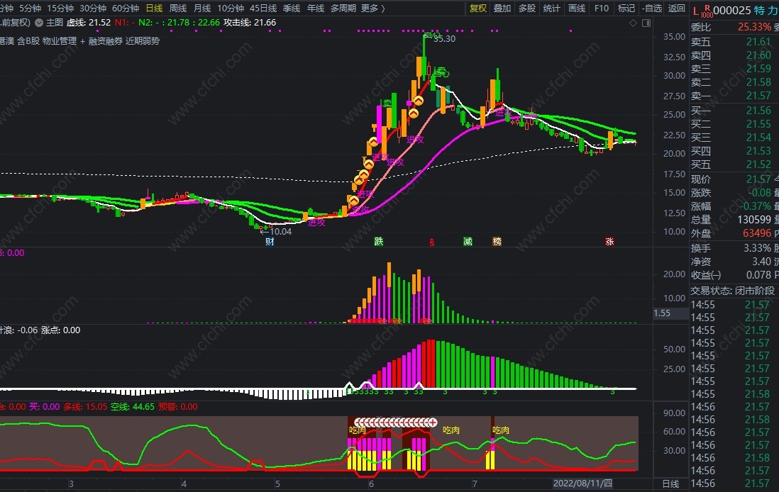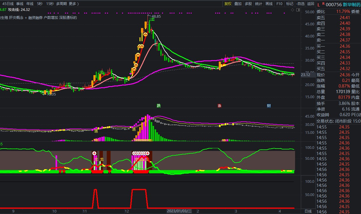 4. 副图3,多线上穿空线,涨停股出现吃肉,下方有黄色和紫色柱,如果连续上涨,就持续出现,上方有红十图标,红色预警线向0轴下方凸起。