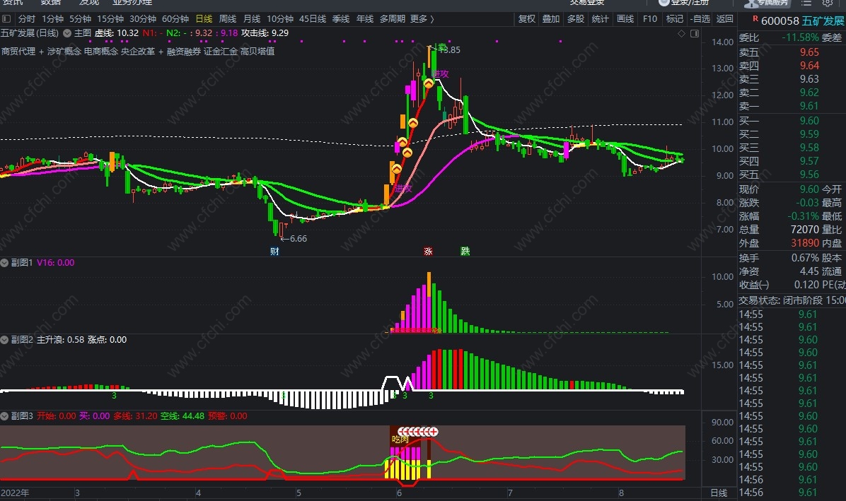 2. 副图1,出现紫柱后,有橙色柱,只要股价不跌破对应K线就安全。如果持续出现,说明股价在走高。出现警字后,如果出险字,可以考虑减仓或观望。第二天如果是警就 说明股价有向上突破,再到险就做减仓或观望,如果跌破K线,不可恋战。