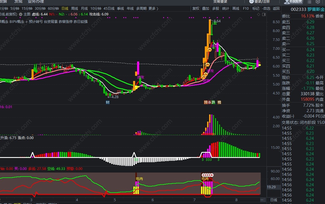 3. 副图2,白色线凸起,有紫色表明可能做多行情,尽量避免绿色和白色区域持股。虽然有时候可能会盈利点减少,多数情况是能避免长期被套的风险。