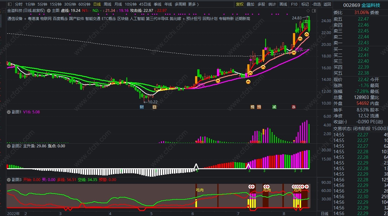 1. 看主图,三根变色线,转为多方颜色,呈发散分离形态,突破白色虚线,可视为走强迹象。