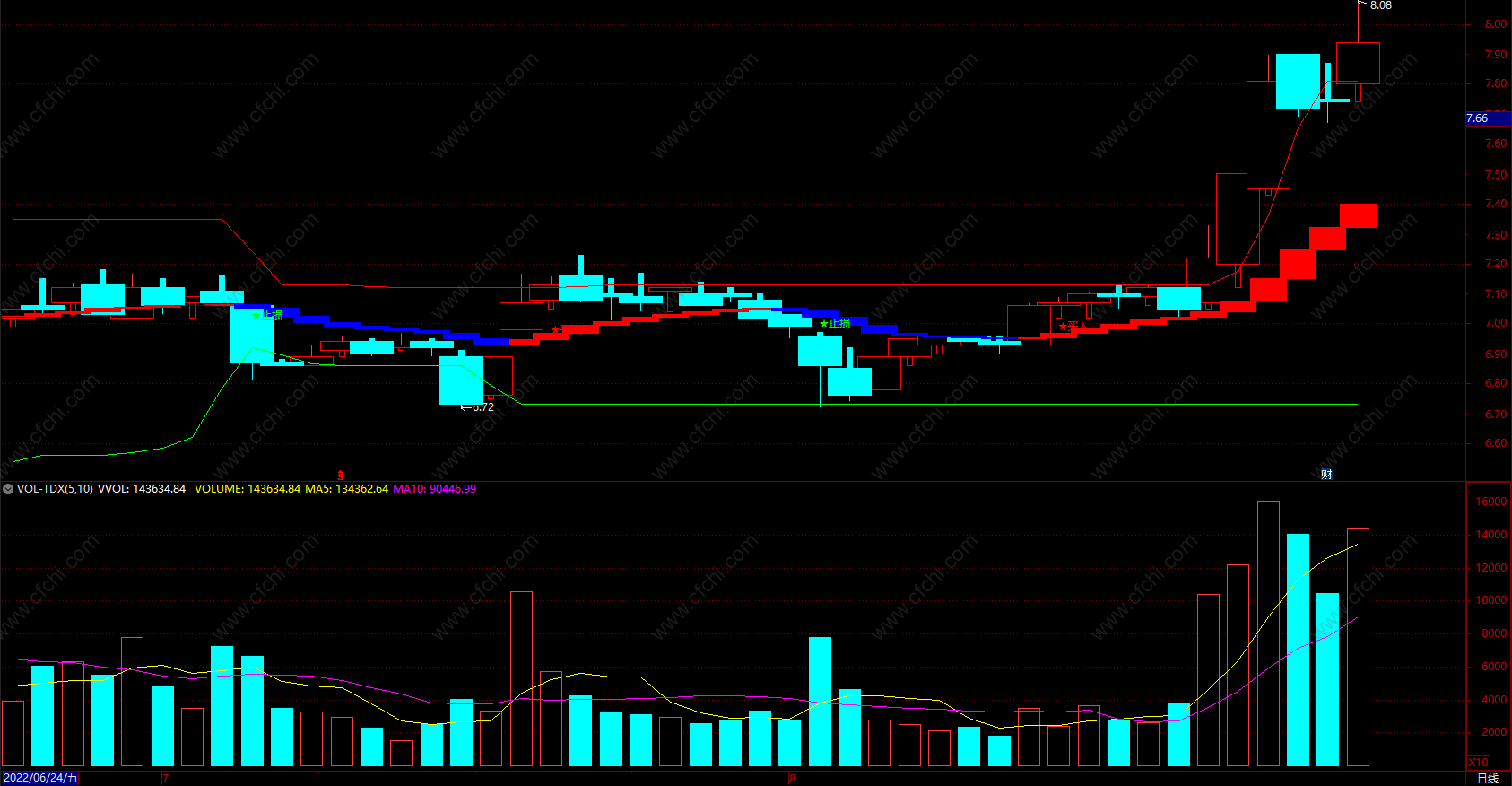 STICKLINE(上收>=上开,上开,上收,6,1 ),COLOR0000FF;