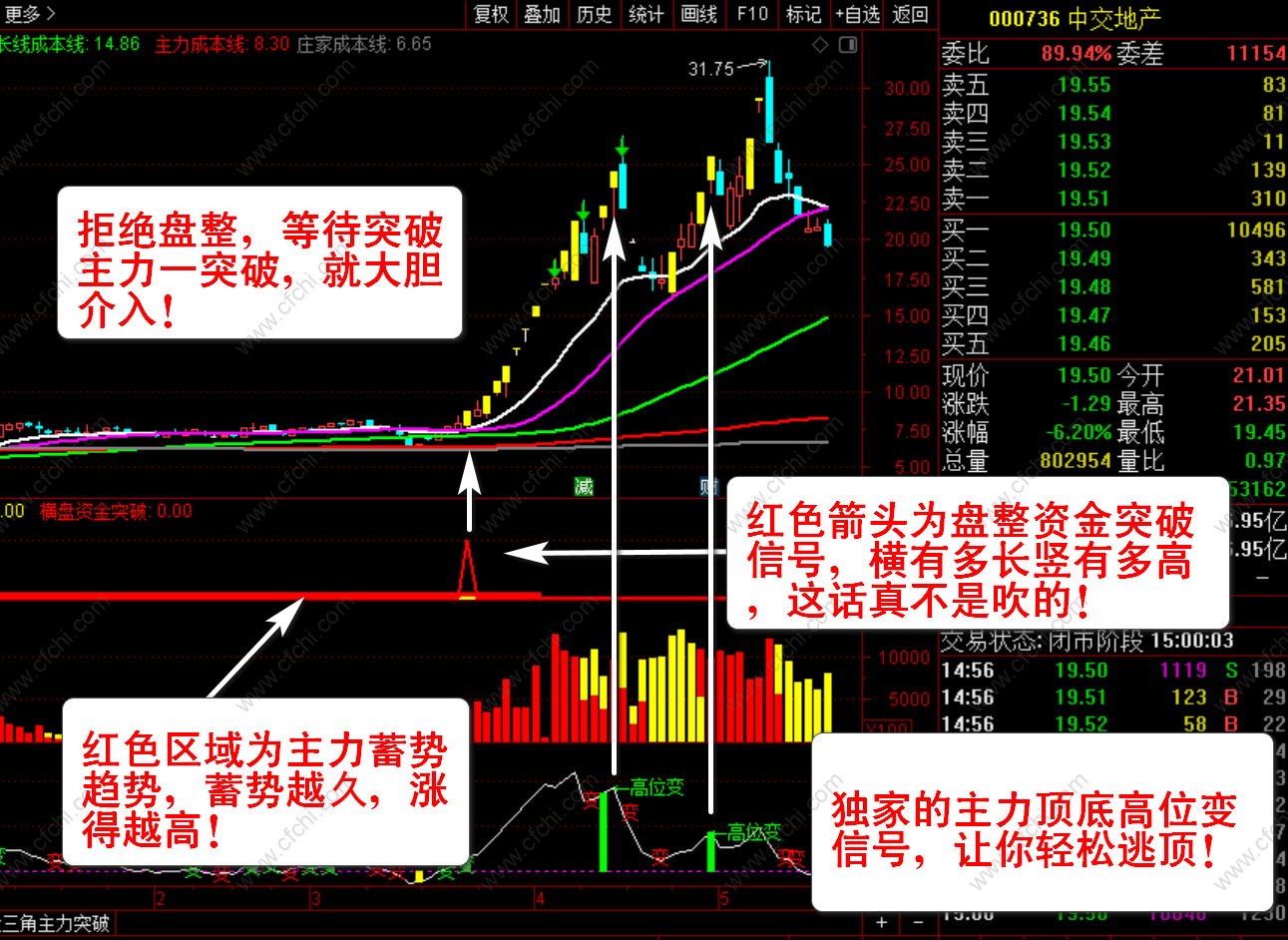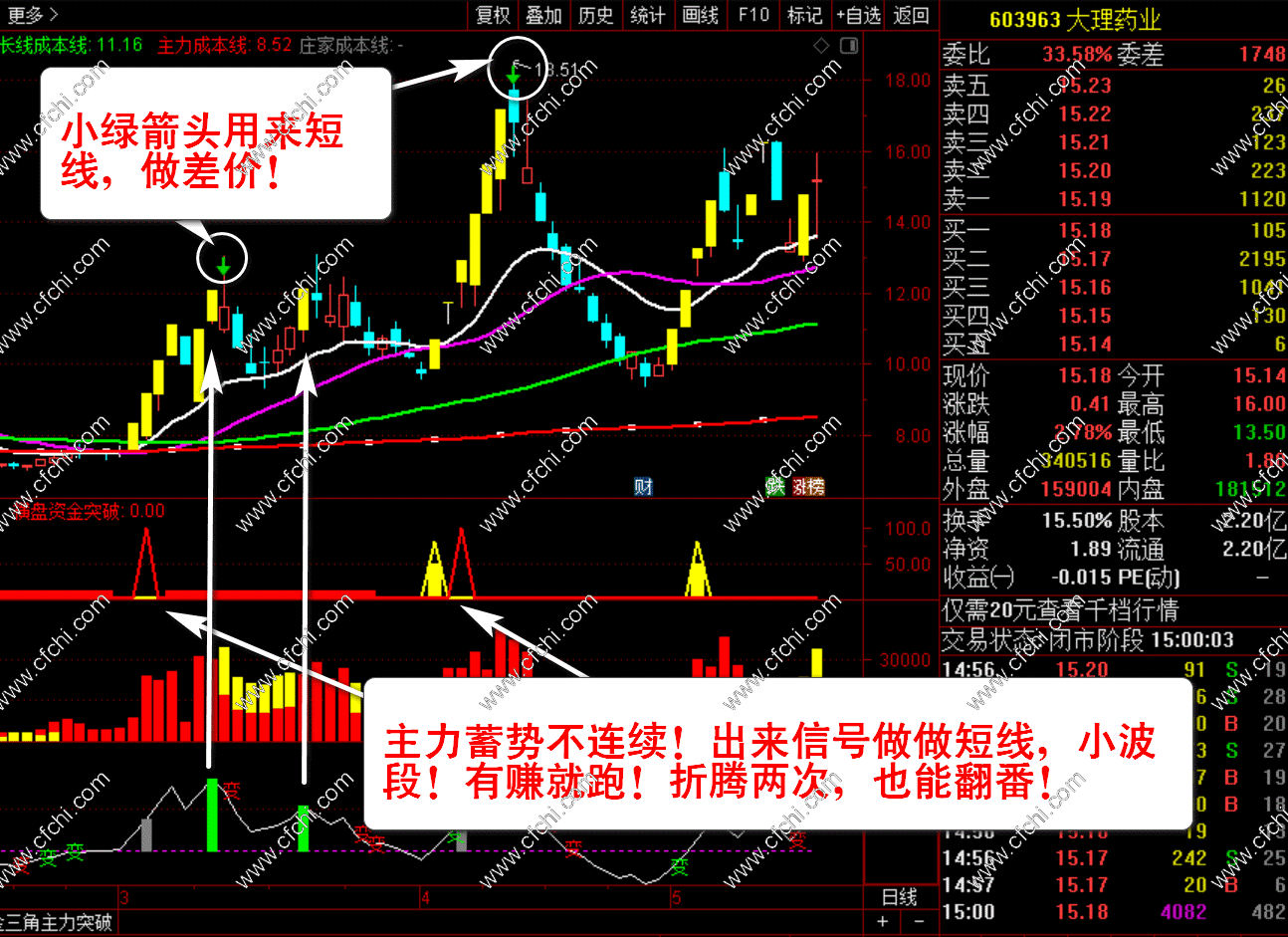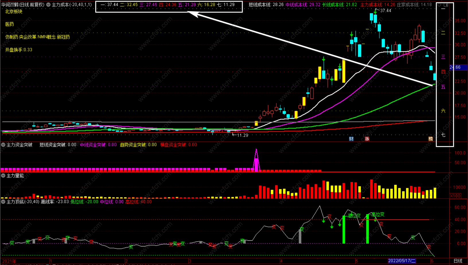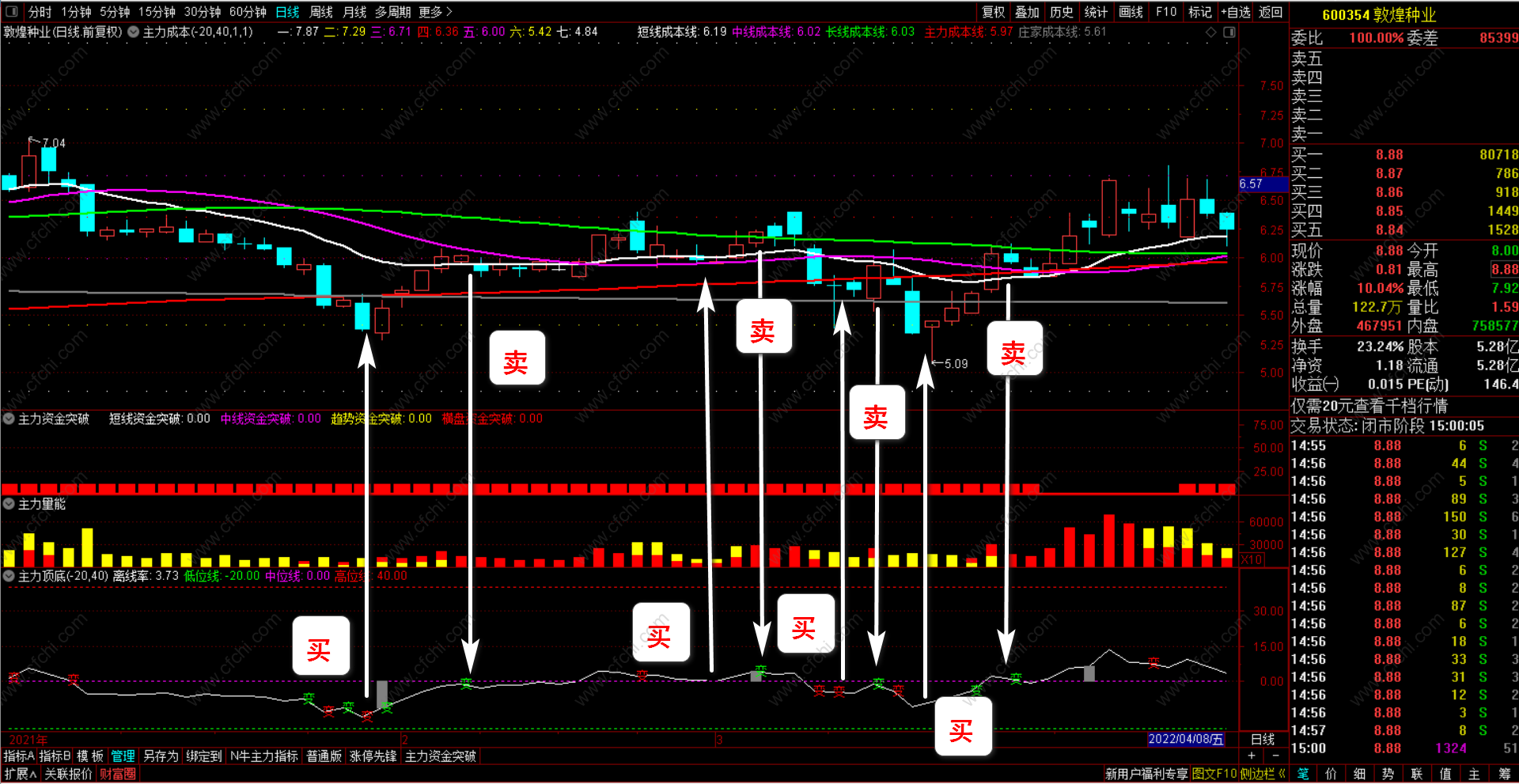 2、【主力资金突破】+【主力量能】+【主力顶底】三个副图指标。